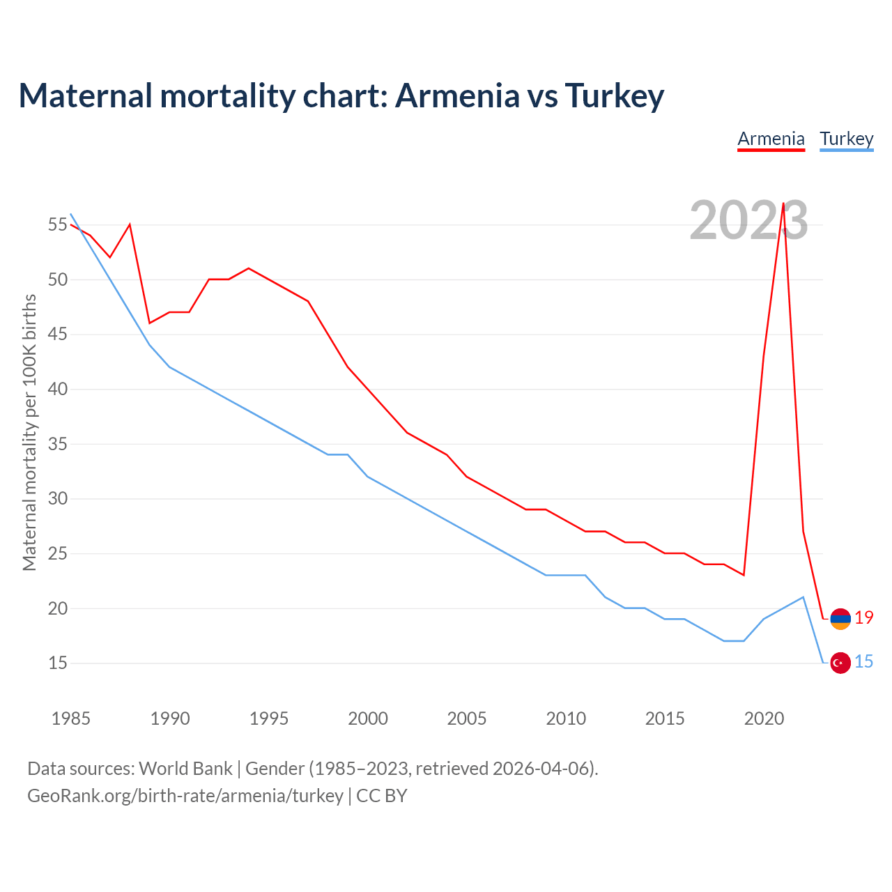 The maternal mortality rate, which is the probability of dying during childbirth or within 42 days of pregnancy termination, is 19 deaths per 100,000 live births in Armenia, compared to 15 deaths in Turkey.