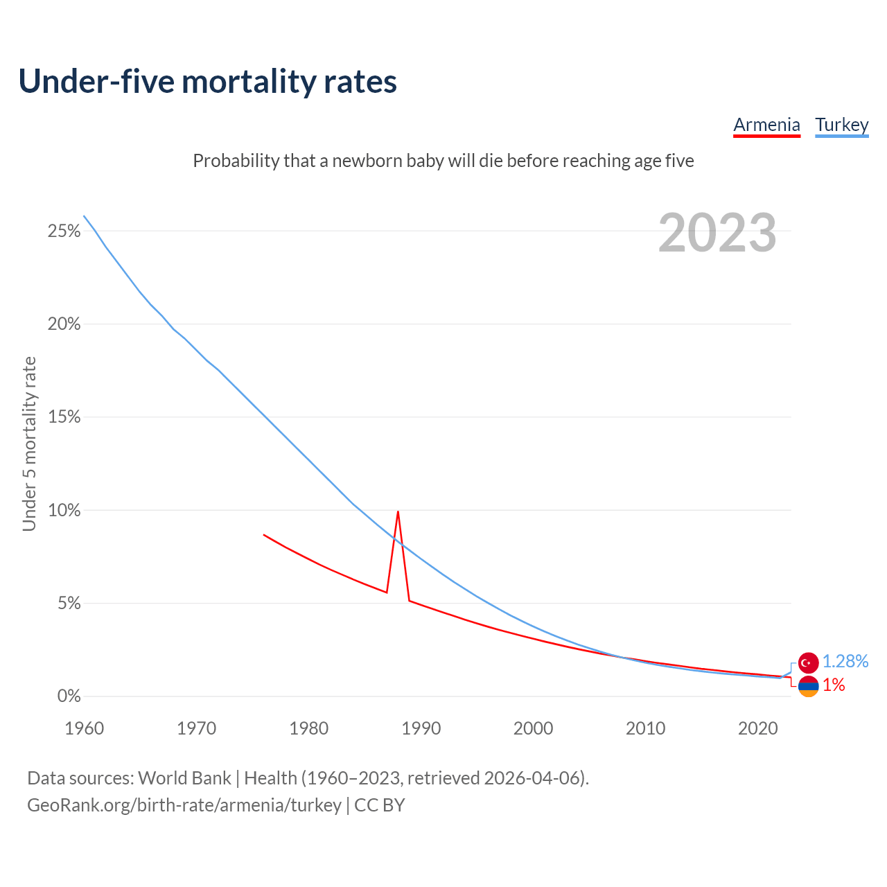 The chance that a newborn baby will die before reaching age five is 1% in Armenia and 1.28% in Turkey. Above is a chart with historical data on under-five mortality rates.