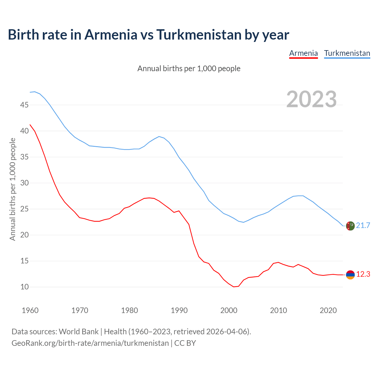 Armenia has an annual birth rate of 12.3 births per 1,000 people, compared to 21.7 for Turkmenistan. The average number of children a woman is expected to have during her lifetime — the fertility rate, is 1.9 in Armenia and 2.69 in Turkmenistan — 41.6% difference.