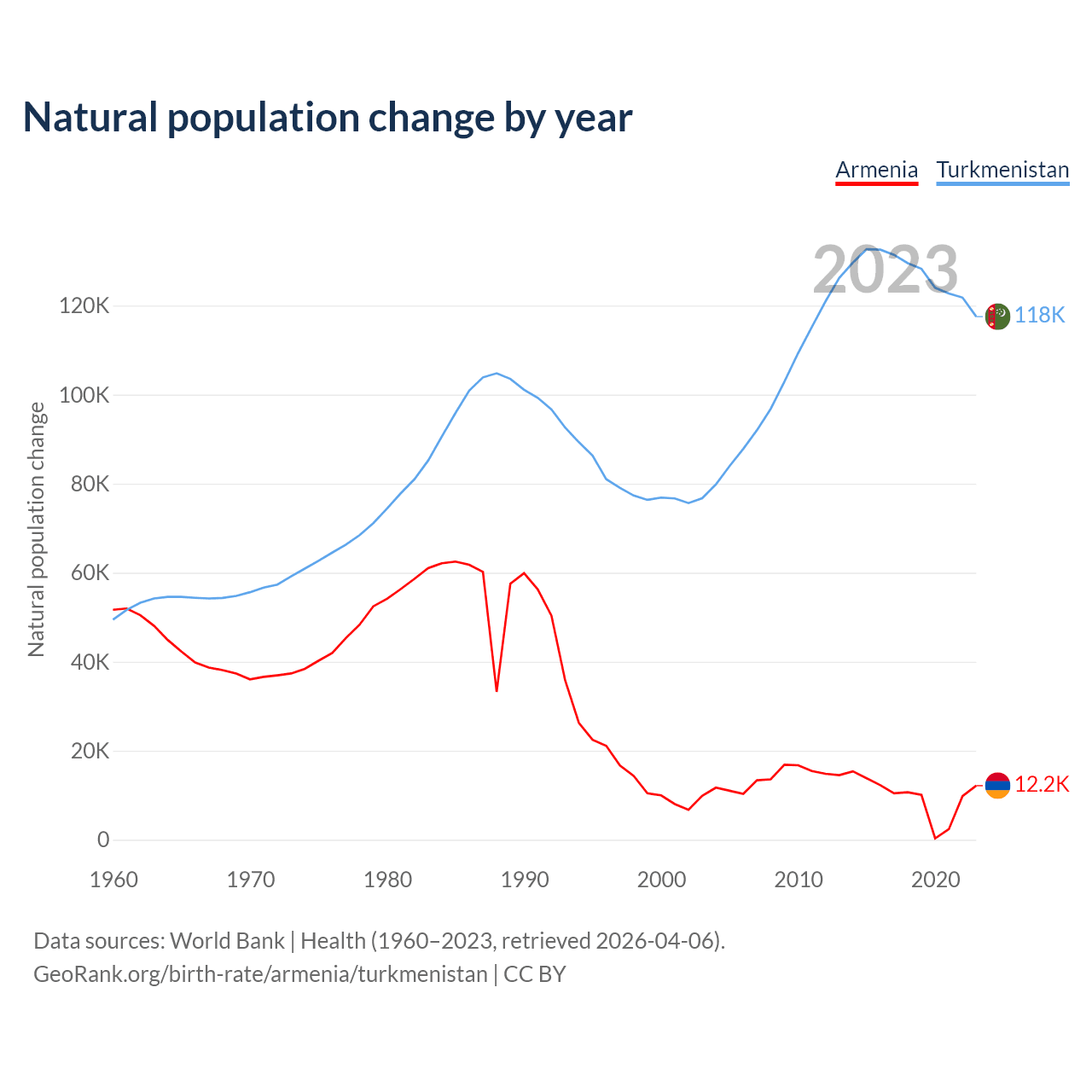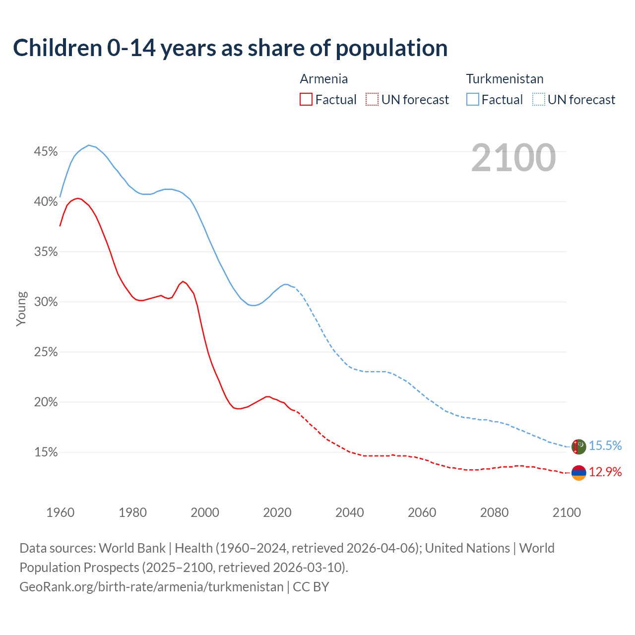 According to the latest available data on birth rates, the fertility rate in Armenia was 1.9 children per woman in 2023, compared to 2.69 in Turkmenistan in 2023. The replacement level is considered to be 2.1 children per woman.