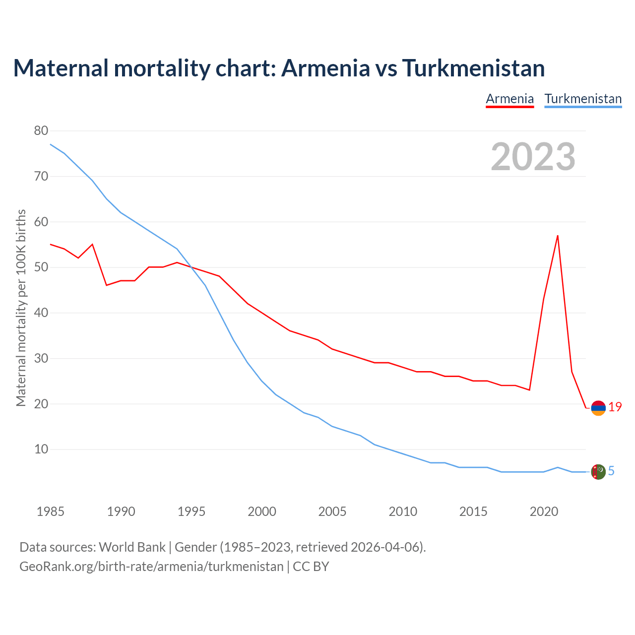 The maternal mortality rate, which is the probability of dying during childbirth or within 42 days of pregnancy termination, is 19 deaths per 100,000 live births in Armenia, compared to 5 deaths in Turkmenistan.
