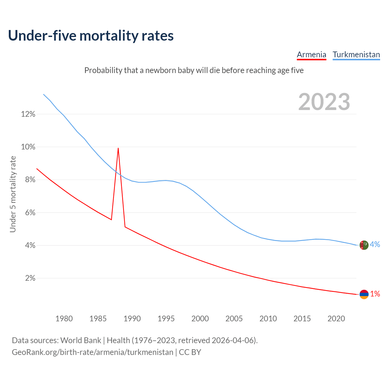 The chance that a newborn baby will die before reaching age five is 1% in Armenia and 4% in Turkmenistan. Above is a chart with historical data on under-five mortality rates.