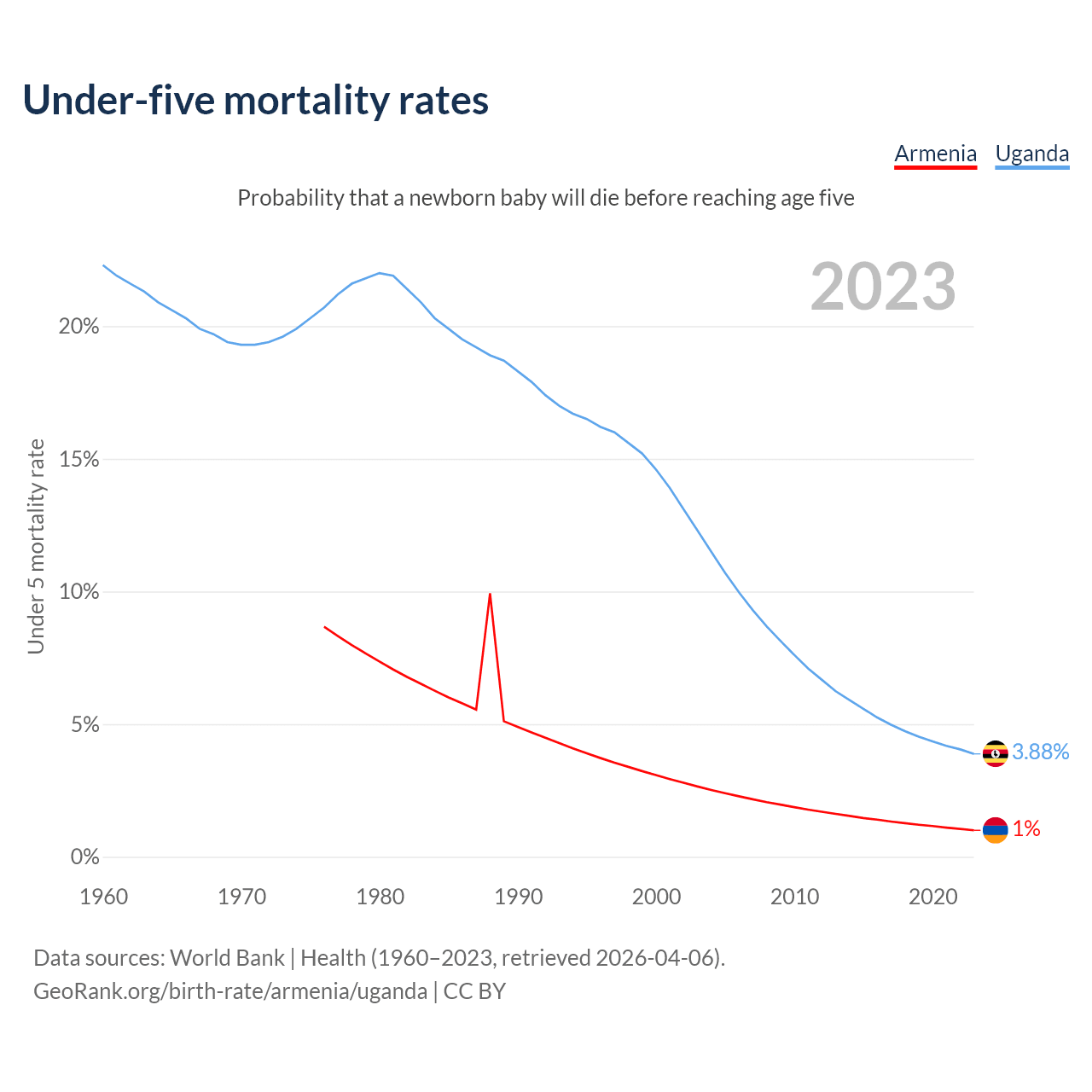 The chance that a newborn baby will die before reaching age five is 1% in Armenia and 3.88% in Uganda. Above is a chart with historical data on under-five mortality rates.