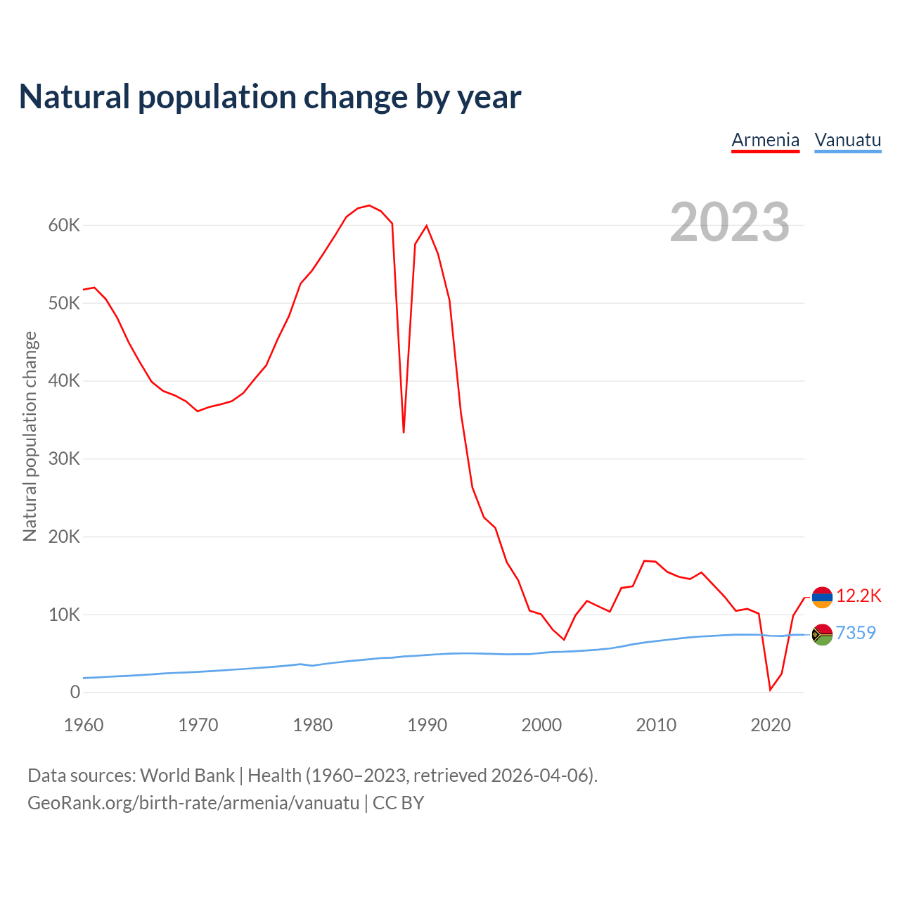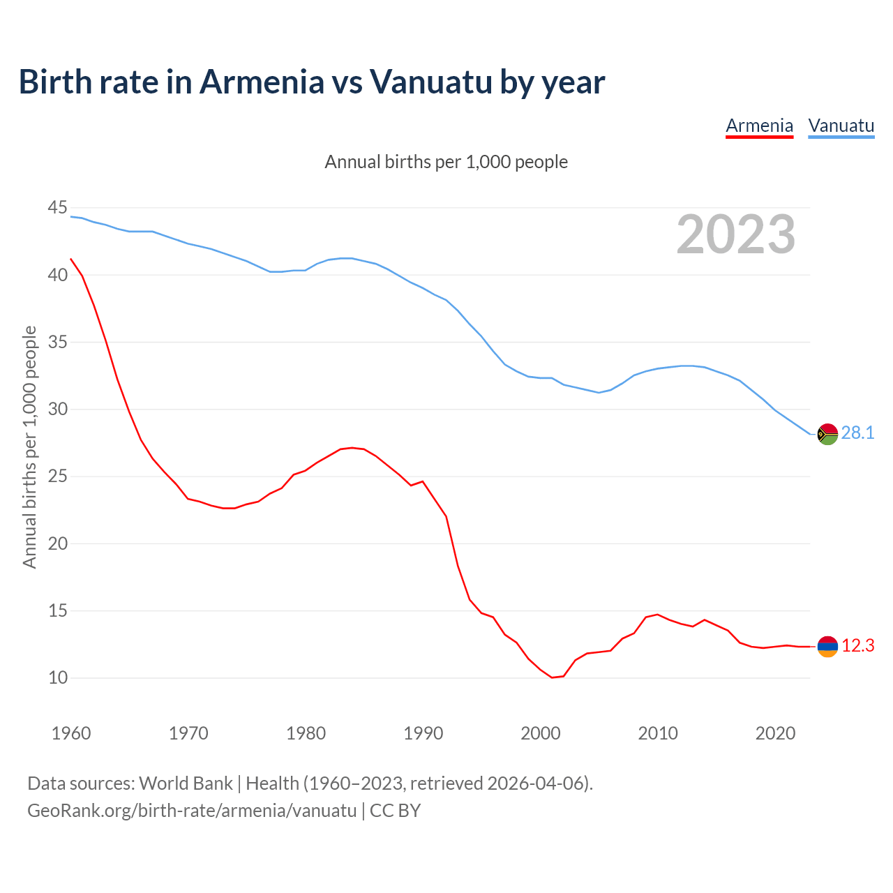 Armenia has an annual birth rate of 12.3 births per 1,000 people, compared to 28.1 for Vanuatu. The average number of children a woman is expected to have during her lifetime — the fertility rate, is 1.9 in Armenia and 3.6 in Vanuatu — 89.3% difference.