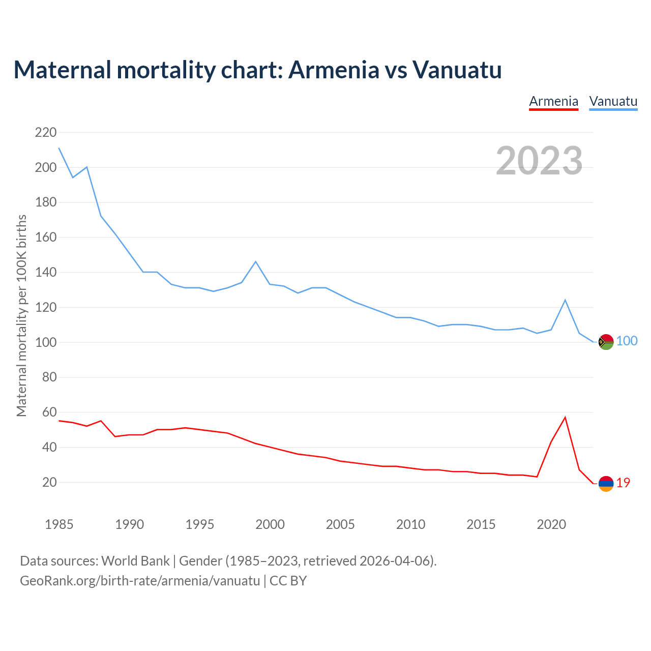The maternal mortality rate, which is the probability of dying during childbirth or within 42 days of pregnancy termination, is 19 deaths per 100,000 live births in Armenia, compared to 100 deaths in Vanuatu.