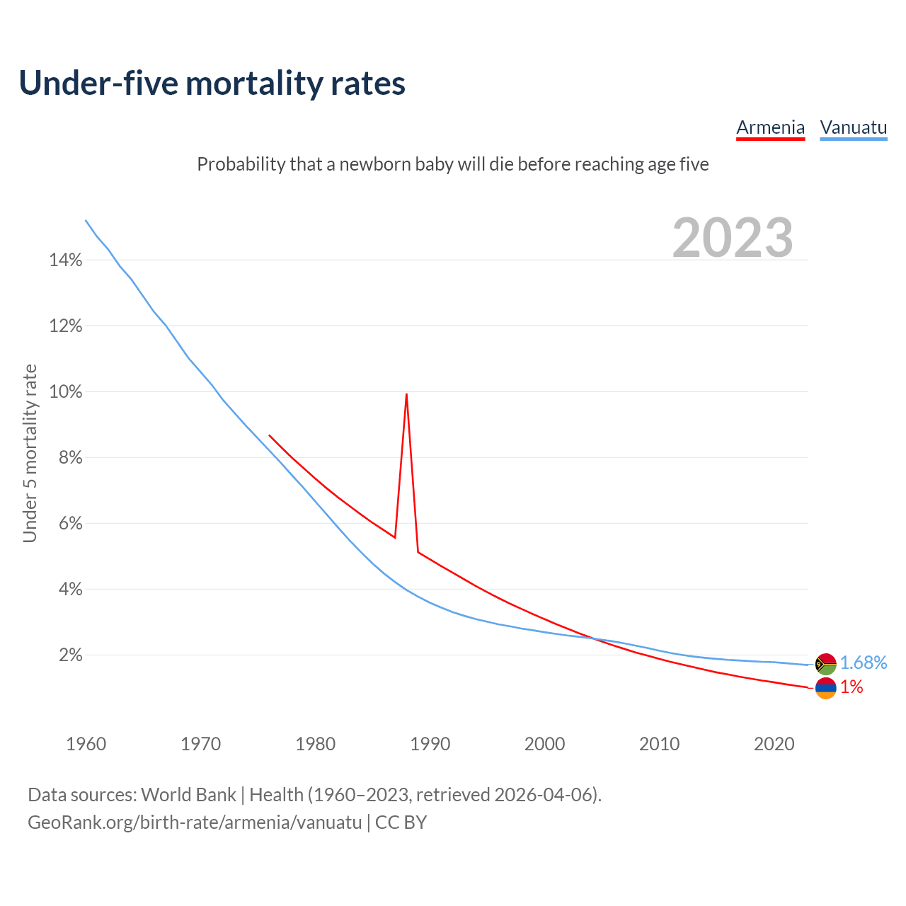 The chance that a newborn baby will die before reaching age five is 1% in Armenia and 1.68% in Vanuatu. Above is a chart with historical data on under-five mortality rates.