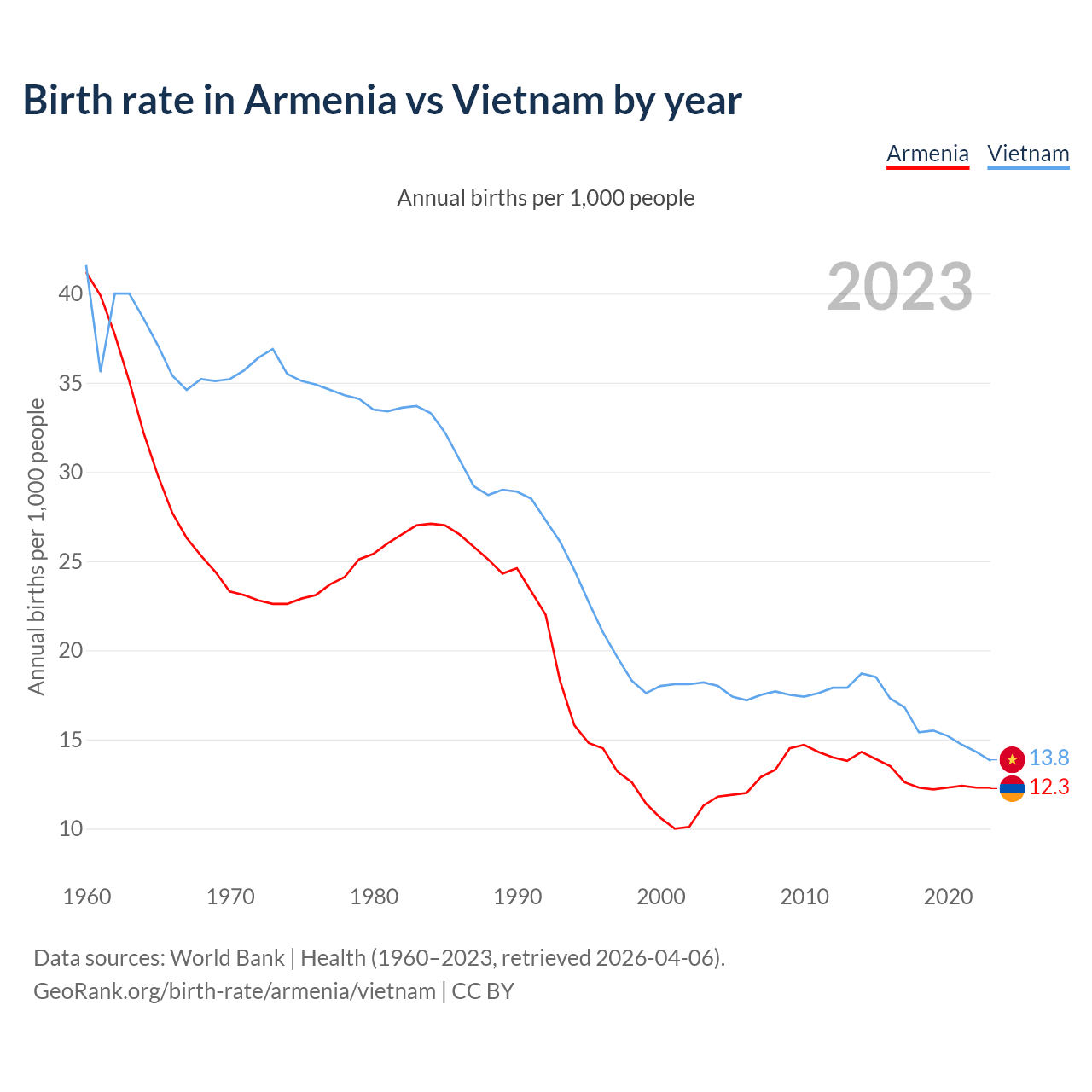 According to the latest available data on birth rates, the fertility rate in Armenia was 1.9 children per woman in 2023, compared to 1.91 in Vietnam in 2023. The replacement level is considered to be 2.1 children per woman.