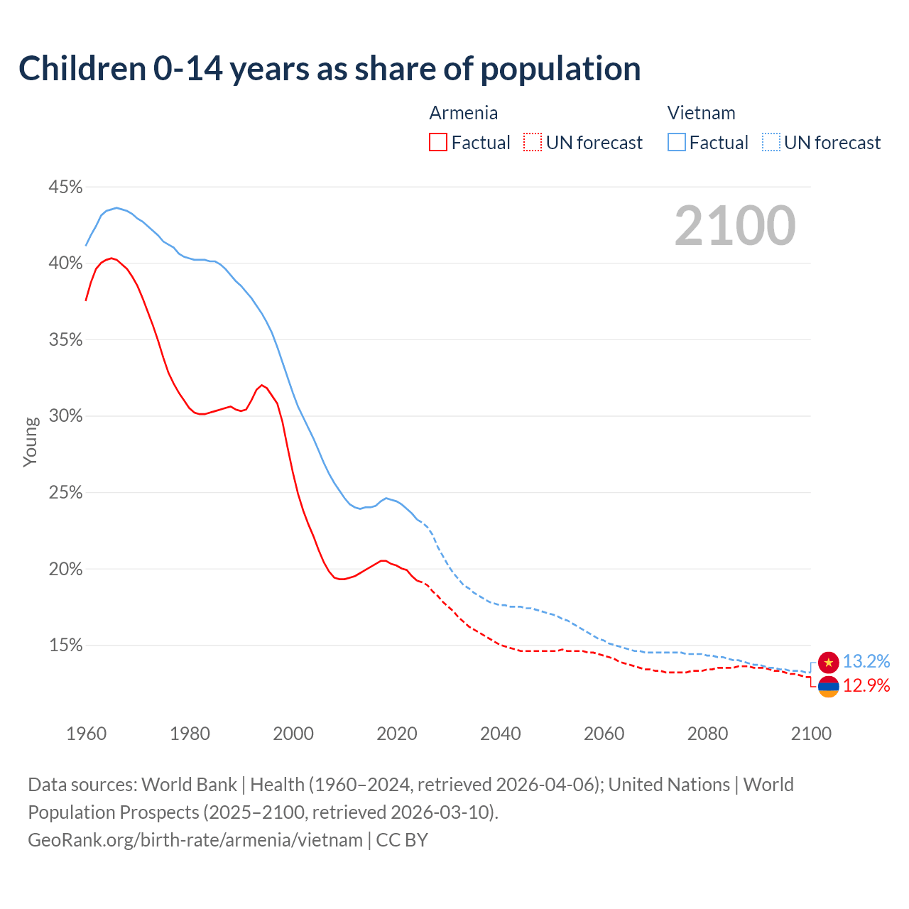 Armenia has an annual birth rate of 12.3 births per 1,000 people, compared to 13.8 for Vietnam. The average number of children a woman is expected to have during her lifetime — the fertility rate, is 1.9 in Armenia and 1.91 in Vietnam — 0.68% difference.