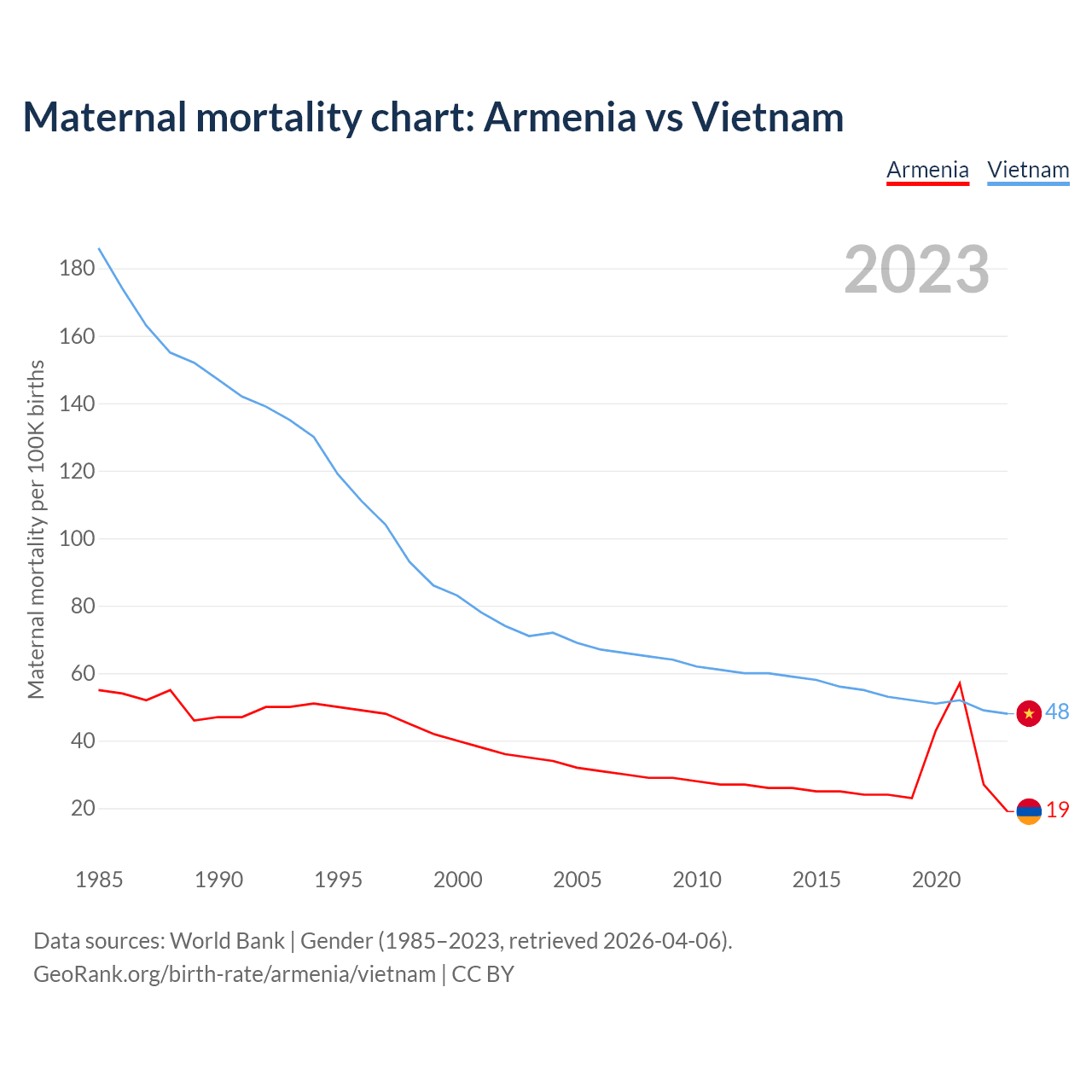The maternal mortality rate, which is the probability of dying during childbirth or within 42 days of pregnancy termination, is 19 deaths per 100,000 live births in Armenia, compared to 48 deaths in Vietnam.