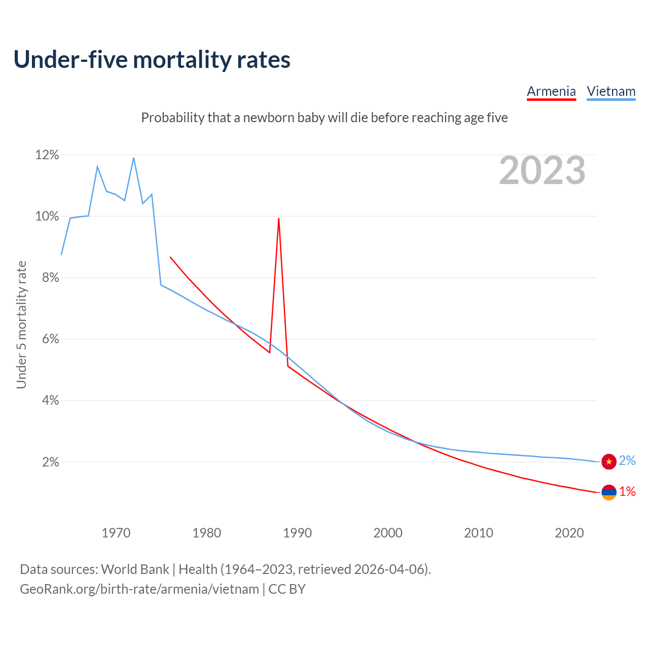 The chance that a newborn baby will die before reaching age five is 1% in Armenia and 2% in Vietnam. Above is a chart with historical data on under-five mortality rates.