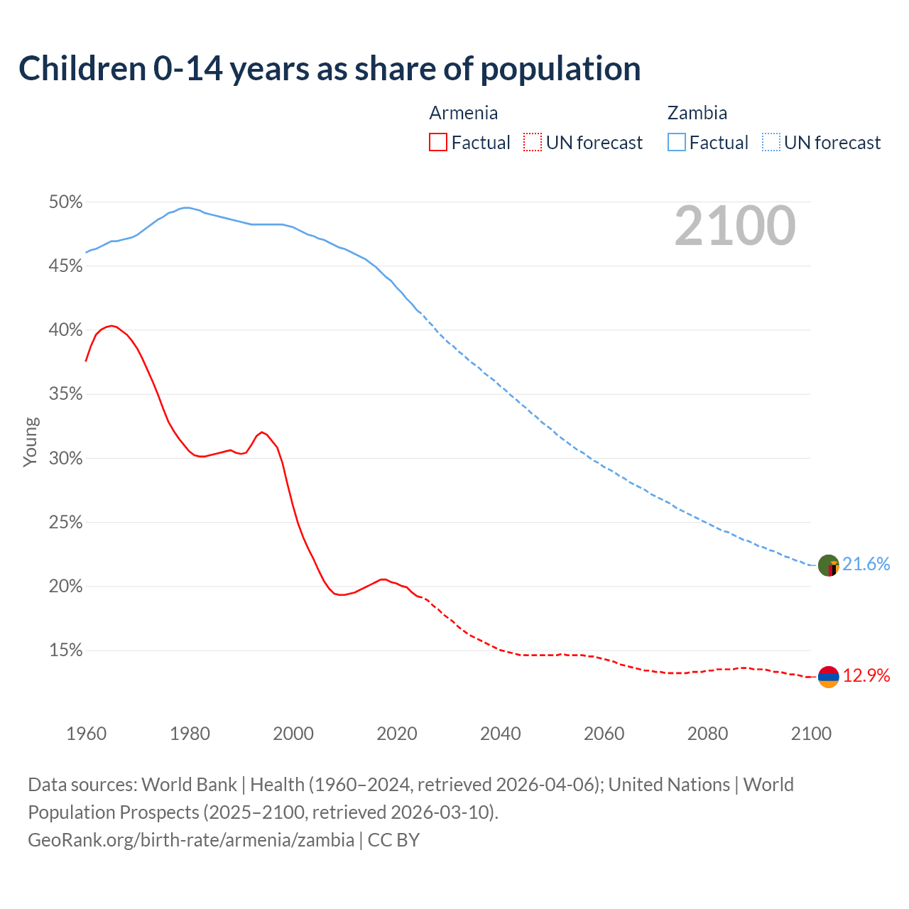 Armenia has an annual birth rate of 12.3 births per 1,000 people, compared to 33.1 for Zambia. The average number of children a woman is expected to have during her lifetime — the fertility rate, is 1.9 in Armenia and 4.1 in Zambia — 115.8% difference.