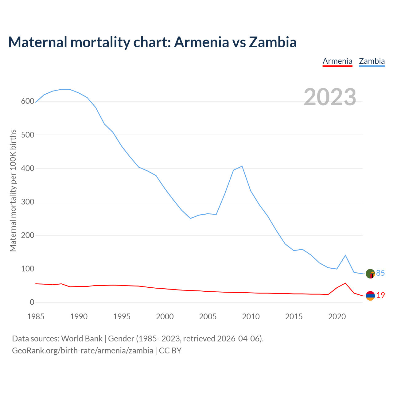 The maternal mortality rate, which is the probability of dying during childbirth or within 42 days of pregnancy termination, is 19 deaths per 100,000 live births in Armenia, compared to 85 deaths in Zambia.
