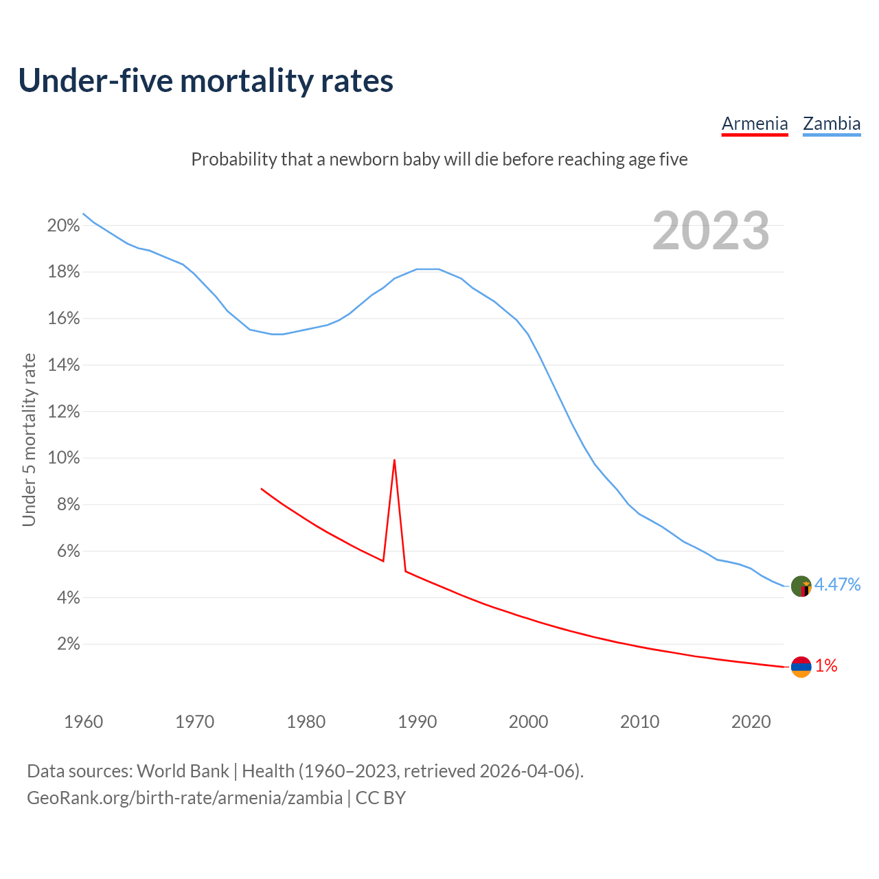 The chance that a newborn baby will die before reaching age five is 1% in Armenia and 4.47% in Zambia. Above is a chart with historical data on under-five mortality rates.