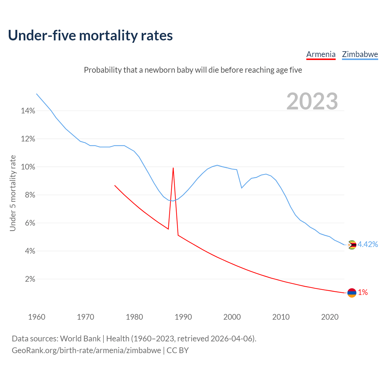 The chance that a newborn baby will die before reaching age five is 1% in Armenia and 4.42% in Zimbabwe. Above is a chart with historical data on under-five mortality rates.