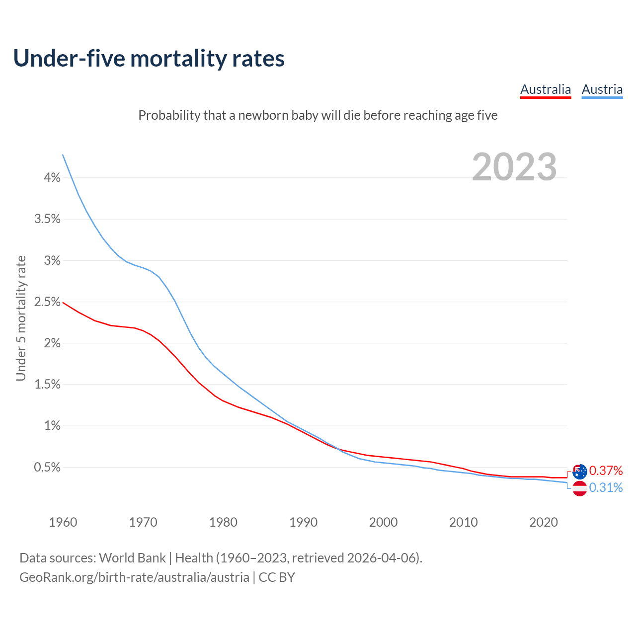 The chance that a newborn baby will die before reaching age five is 0.37% in Australia and 0.31% in Austria. Above is a chart with historical data on under-five mortality rates.
