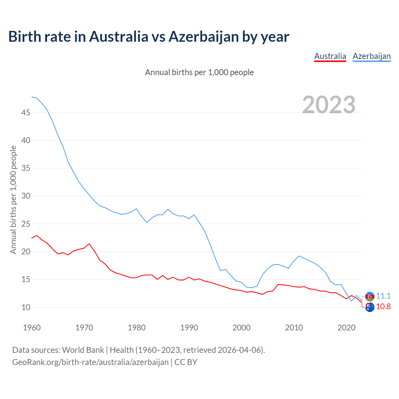 According to the latest available data on birth rates, the fertility rate in Australia was 1.5 children per woman in 2023, compared to 1.55 in Azerbaijan in 2023. The replacement level is considered to be 2.1 children per woman.