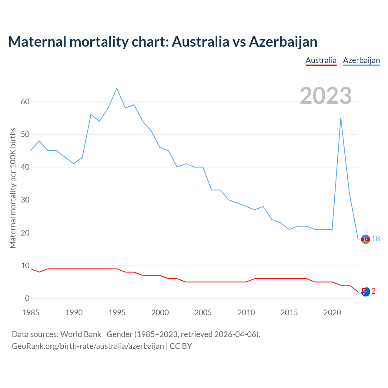 The maternal mortality rate, which is the probability of dying during childbirth or within 42 days of pregnancy termination, is 2 deaths per 100,000 live births in Australia, compared to 18 deaths in Azerbaijan.