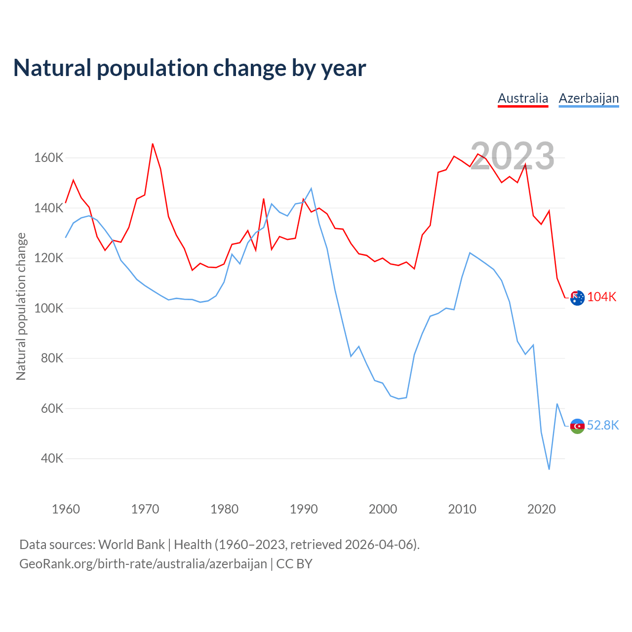 Australia has an annual birth rate of 10.8 births per 1,000 people, compared to 11.1 for Azerbaijan. The average number of children a woman is expected to have during her lifetime — the fertility rate, is 1.5 in Australia and 1.55 in Azerbaijan — 3.33% difference.