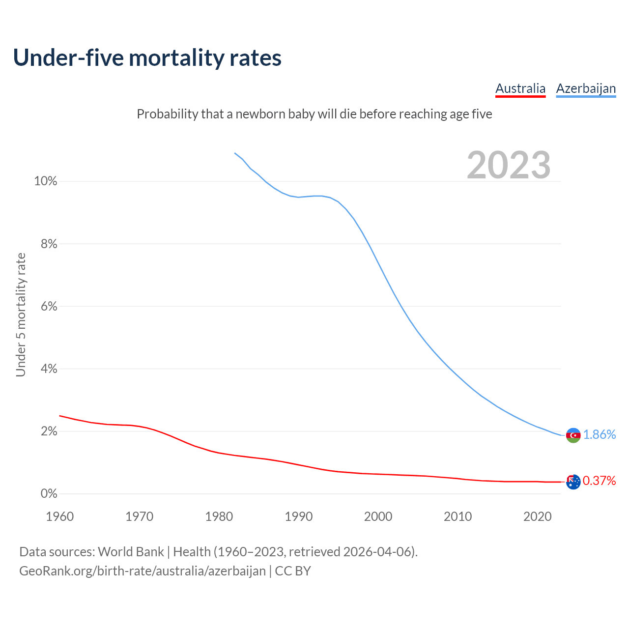 The chance that a newborn baby will die before reaching age five is 0.37% in Australia and 1.86% in Azerbaijan. Above is a chart with historical data on under-five mortality rates.