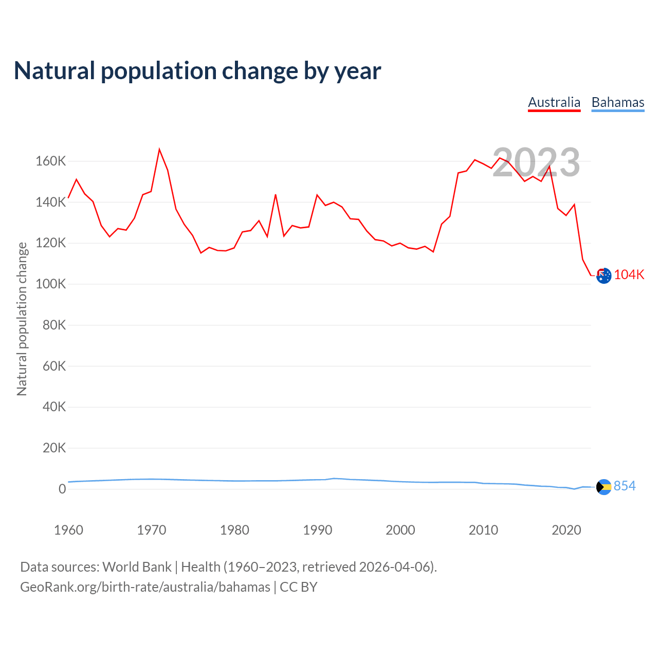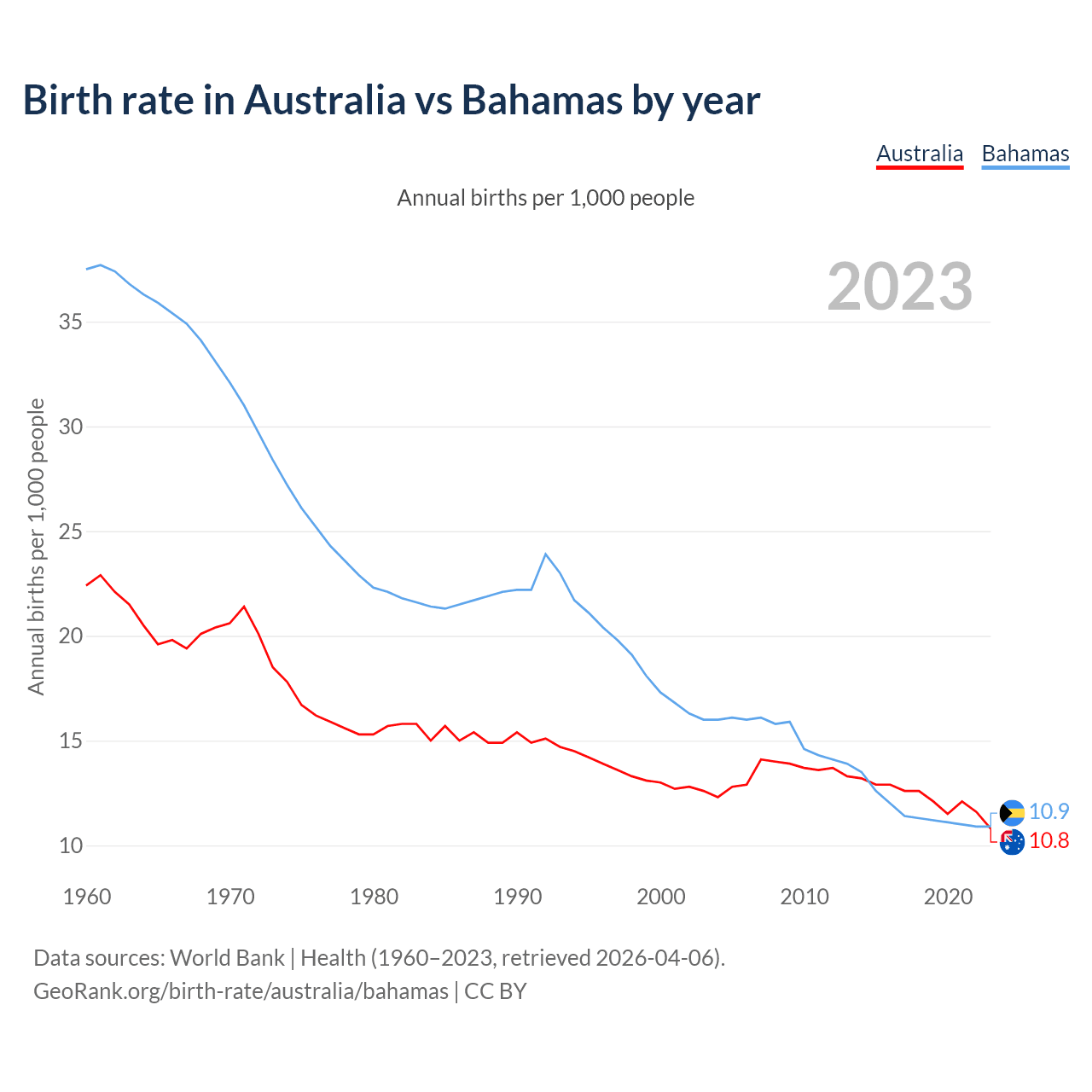 Australia has an annual birth rate of 10.8 births per 1,000 people, compared to 10.9 for the Bahamas. The average number of children a woman is expected to have during her lifetime — the fertility rate, is 1.5 in Australia and 1.37 in the Bahamas — 8.47% difference.