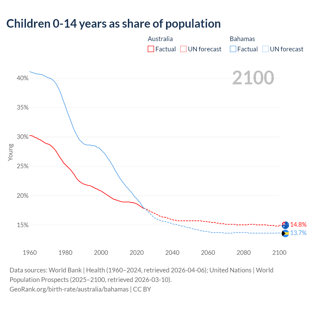 According to the latest available data on birth rates, the fertility rate in Australia was 1.5 children per woman in 2023, compared to 1.37 in the Bahamas in 2023. The replacement level is considered to be 2.1 children per woman.
