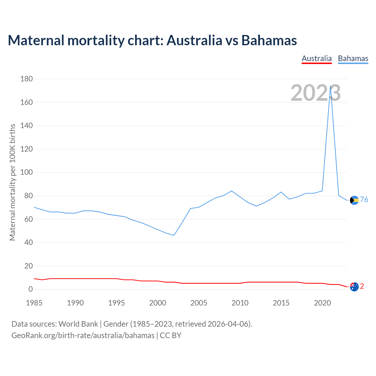 The maternal mortality rate, which is the probability of dying during childbirth or within 42 days of pregnancy termination, is 2 deaths per 100,000 live births in Australia, compared to 76 deaths in the Bahamas.