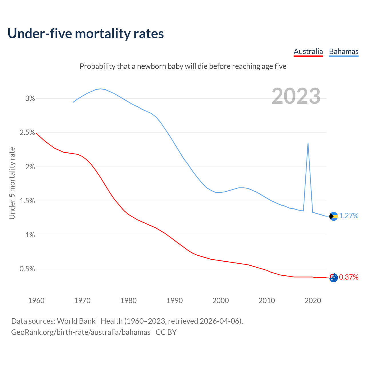The chance that a newborn baby will die before reaching age five is 0.37% in Australia and 1.27% in the Bahamas. Above is a chart with historical data on under-five mortality rates.