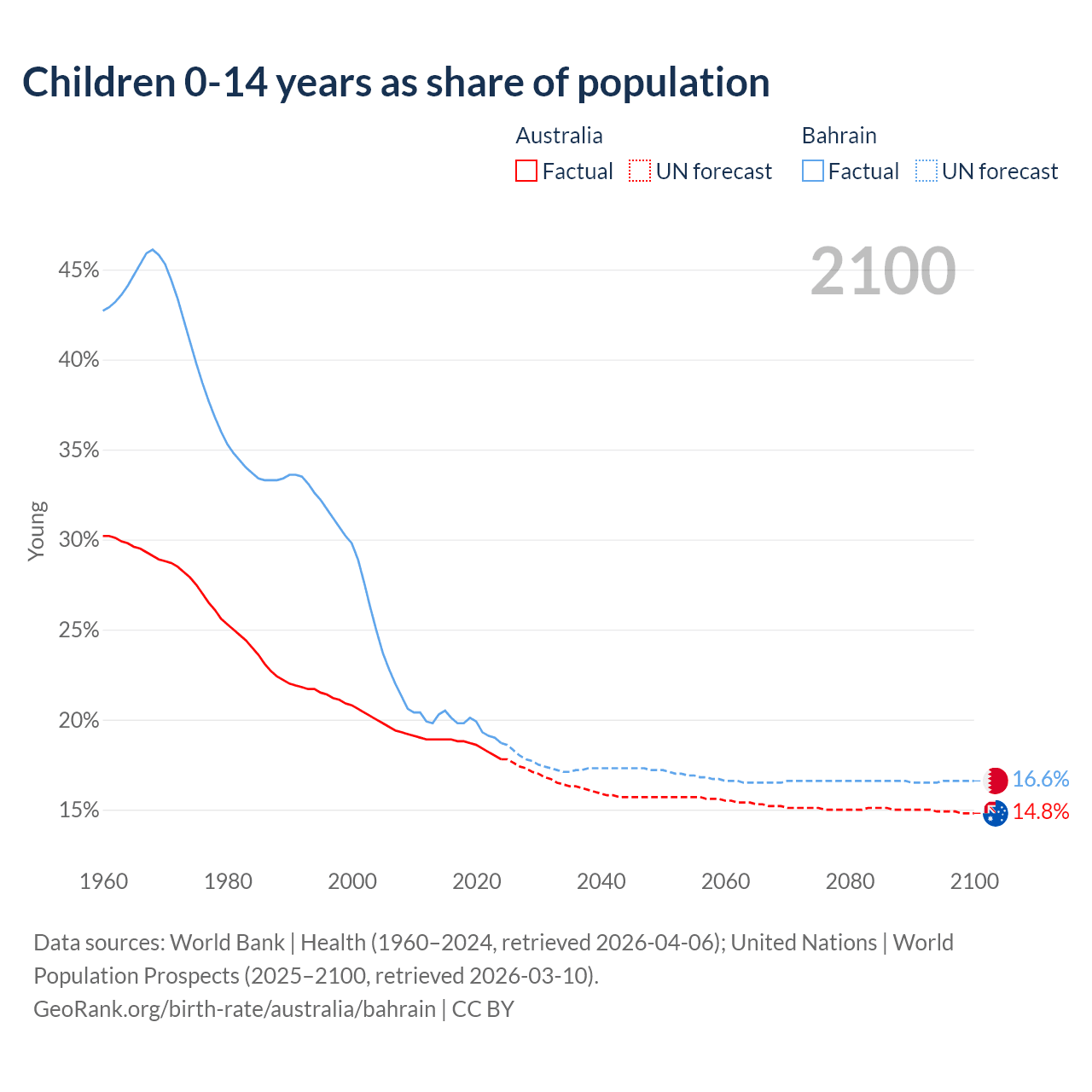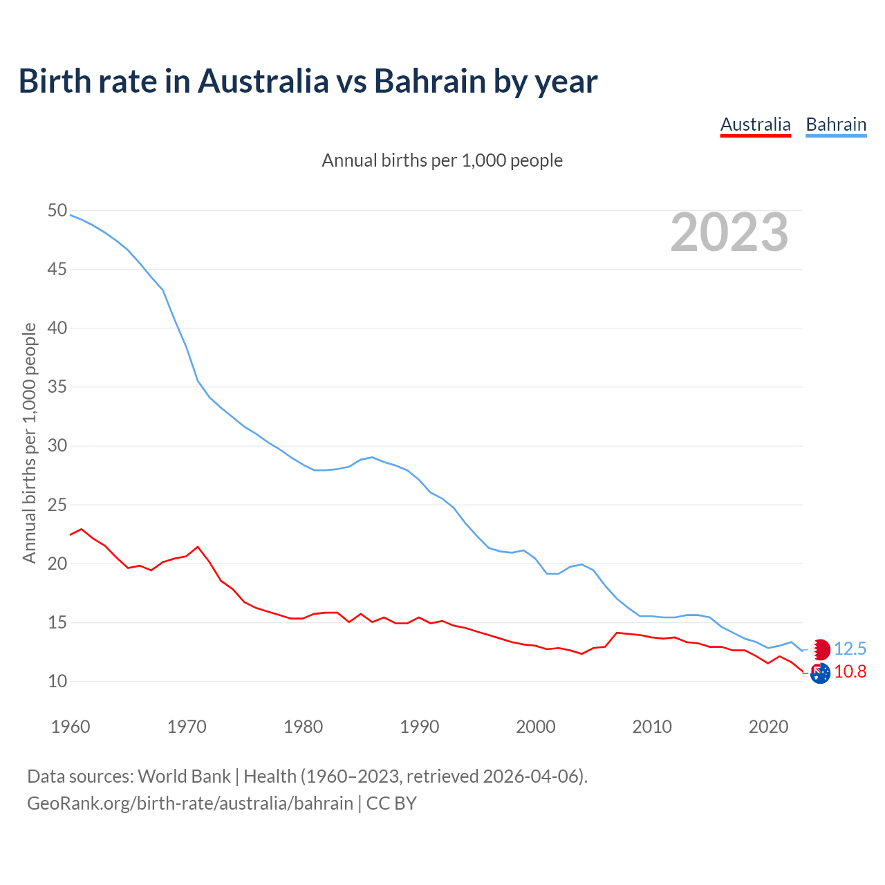 According to the latest available data on birth rates, the fertility rate in Australia was 1.5 children per woman in 2023, compared to 1.82 in Bahrain in 2023. The replacement level is considered to be 2.1 children per woman.