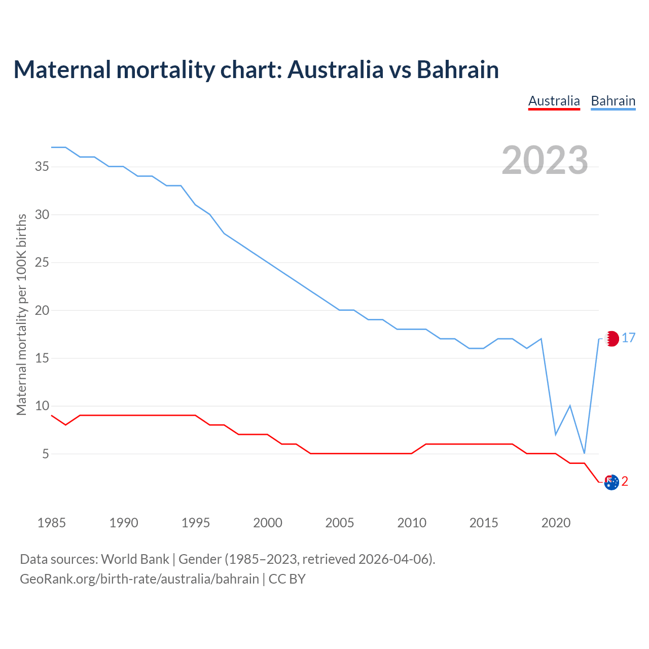 The maternal mortality rate, which is the probability of dying during childbirth or within 42 days of pregnancy termination, is 2 deaths per 100,000 live births in Australia, compared to 17 deaths in Bahrain.