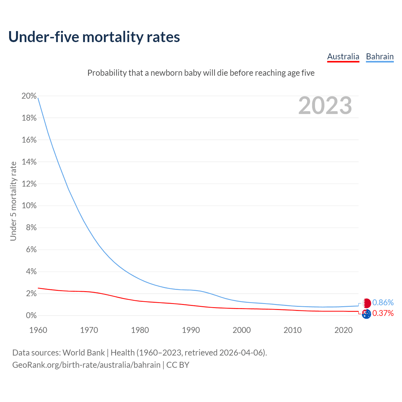 The chance that a newborn baby will die before reaching age five is 0.37% in Australia and 0.86% in Bahrain. Above is a chart with historical data on under-five mortality rates.
