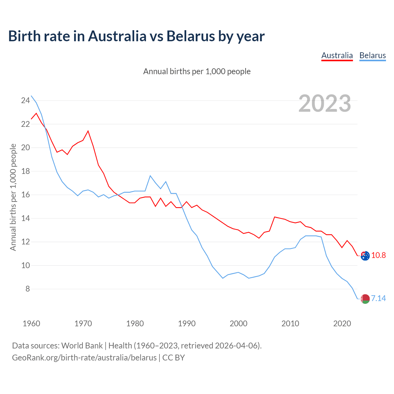 According to the latest available data on birth rates, the fertility rate in Australia was 1.5 children per woman in 2023, compared to 1.21 in Belarus in 2023. The replacement level is considered to be 2.1 children per woman.