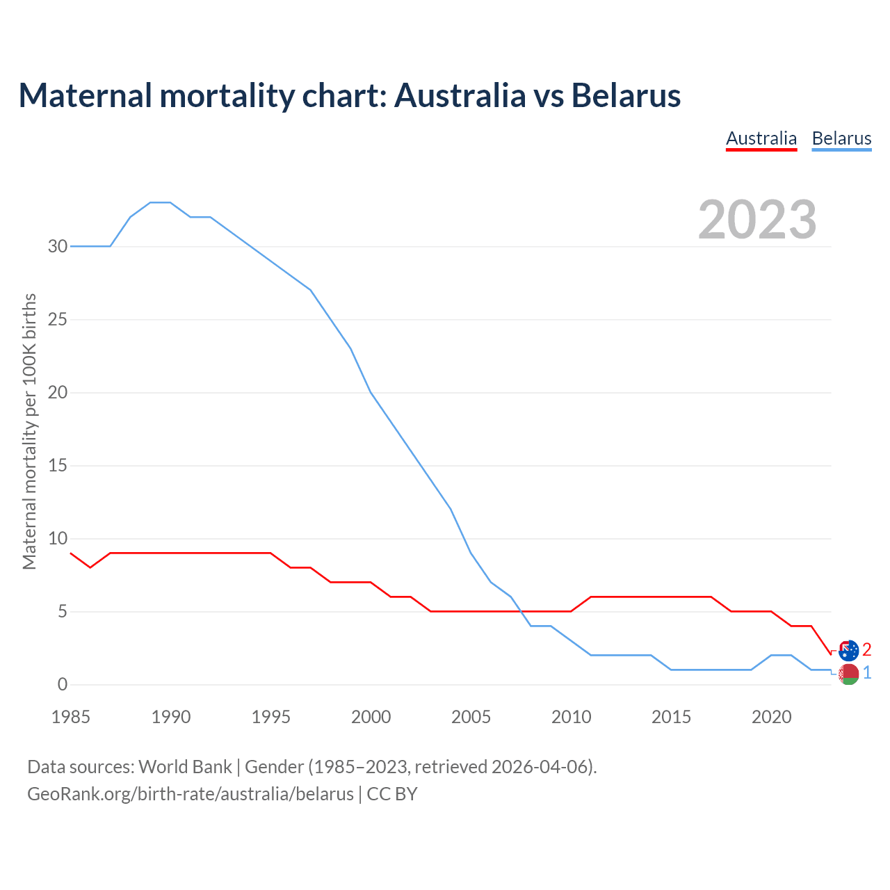 The maternal mortality rate, which is the probability of dying during childbirth or within 42 days of pregnancy termination, is 2 deaths per 100,000 live births in Australia, compared to 1 deaths in Belarus.