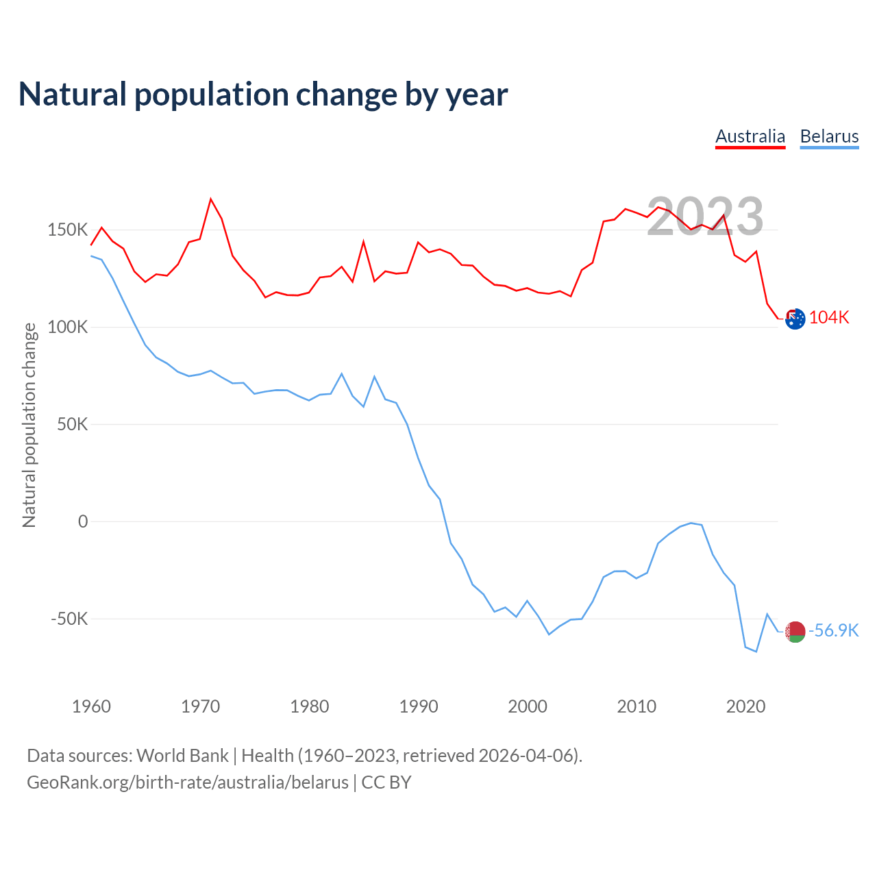 Australia has an annual birth rate of 10.8 births per 1,000 people, compared to 7.14 for Belarus. The average number of children a woman is expected to have during her lifetime — the fertility rate, is 1.5 in Australia and 1.21 in Belarus — 19.5% difference.