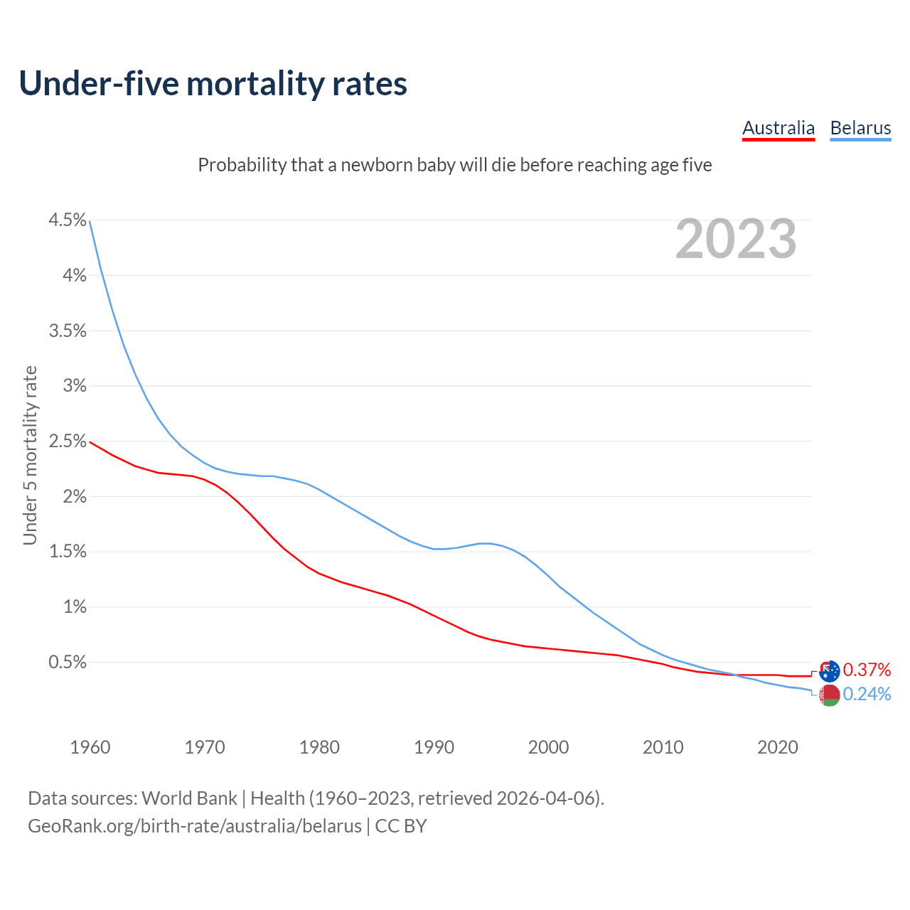 The chance that a newborn baby will die before reaching age five is 0.37% in Australia and 0.24% in Belarus. Above is a chart with historical data on under-five mortality rates.