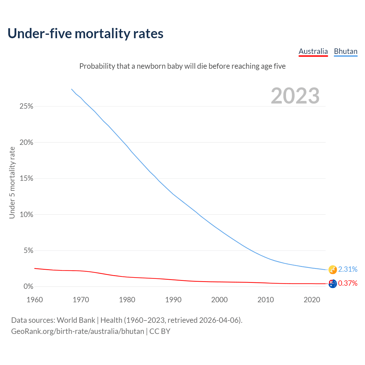 The chance that a newborn baby will die before reaching age five is 0.37% in Australia and 2.31% in Bhutan. Above is a chart with historical data on under-five mortality rates.