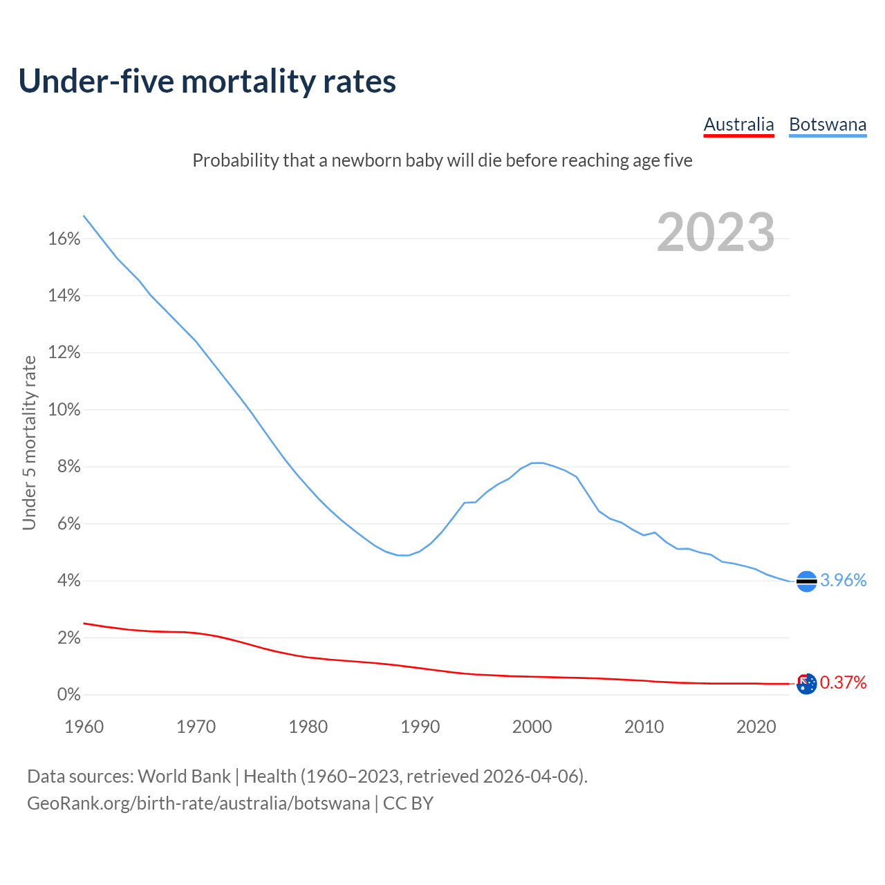The chance that a newborn baby will die before reaching age five is 0.37% in Australia and 3.96% in Botswana. Above is a chart with historical data on under-five mortality rates.