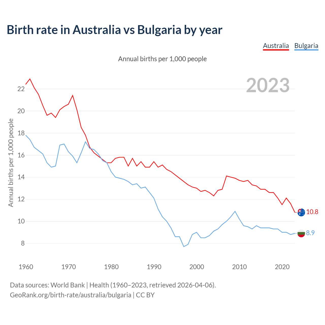 Australia has an annual birth rate of 10.8 births per 1,000 people, compared to 8.9 for Bulgaria. The average number of children a woman is expected to have during her lifetime — the fertility rate, is 1.5 in Australia and 1.81 in Bulgaria — 20.7% difference.