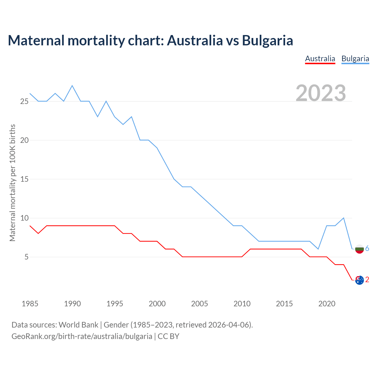 The maternal mortality rate, which is the probability of dying during childbirth or within 42 days of pregnancy termination, is 2 deaths per 100,000 live births in Australia, compared to 6 deaths in Bulgaria.