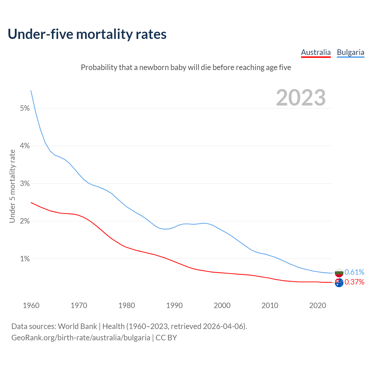 The chance that a newborn baby will die before reaching age five is 0.37% in Australia and 0.61% in Bulgaria. Above is a chart with historical data on under-five mortality rates.