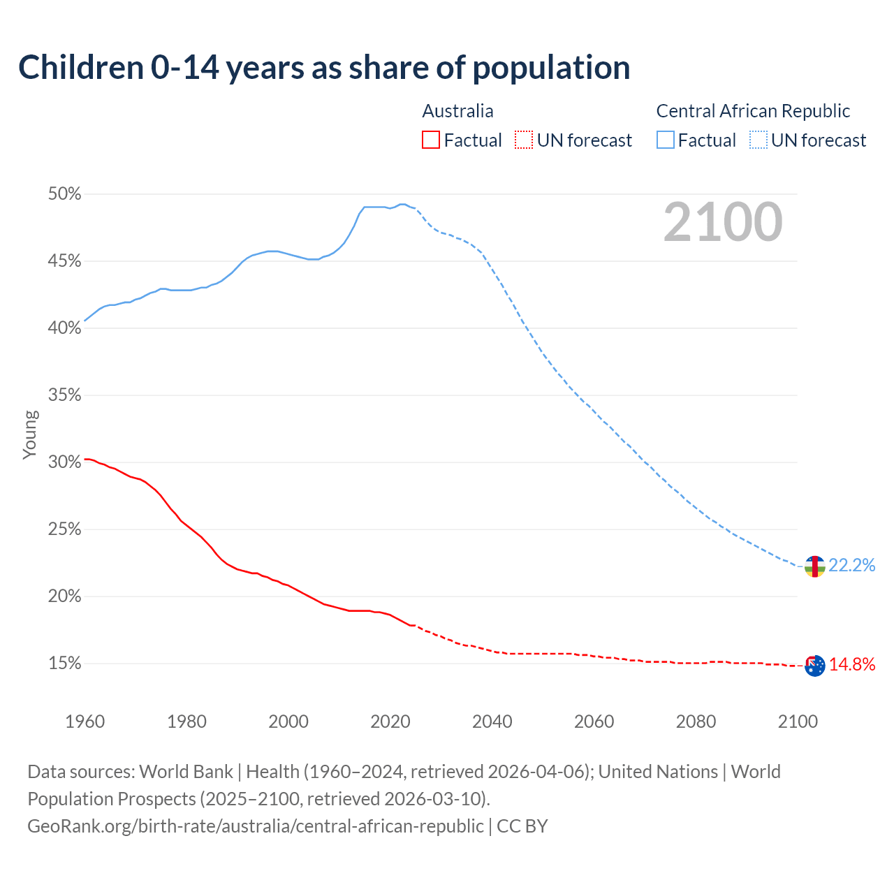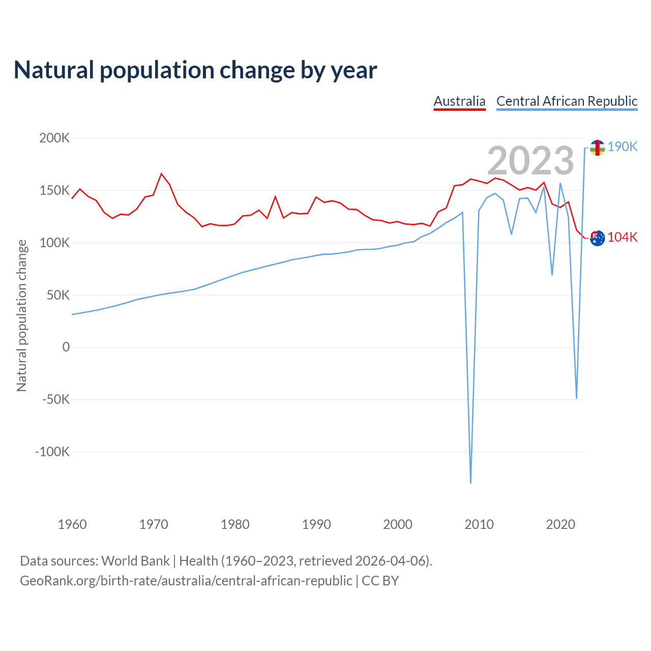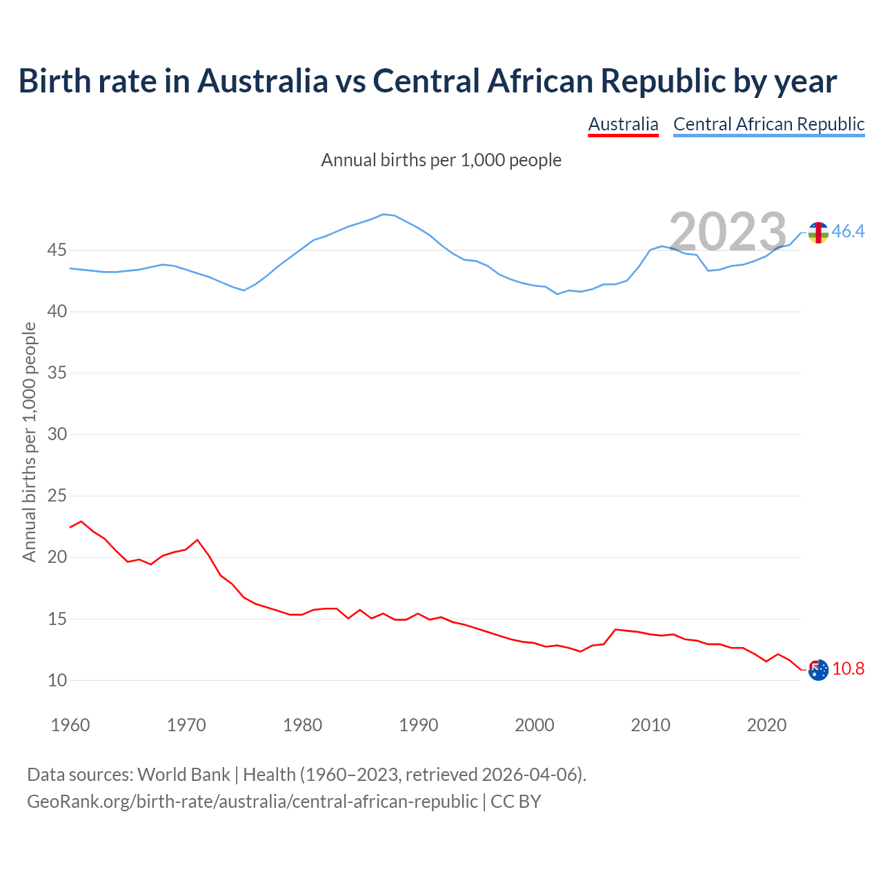 Australia has an annual birth rate of 10.8 births per 1,000 people, compared to 46.4 for the Central African Republic. The average number of children a woman is expected to have during her lifetime — the fertility rate, is 1.5 in Australia and 6.01 in the Central African Republic — 301% difference.