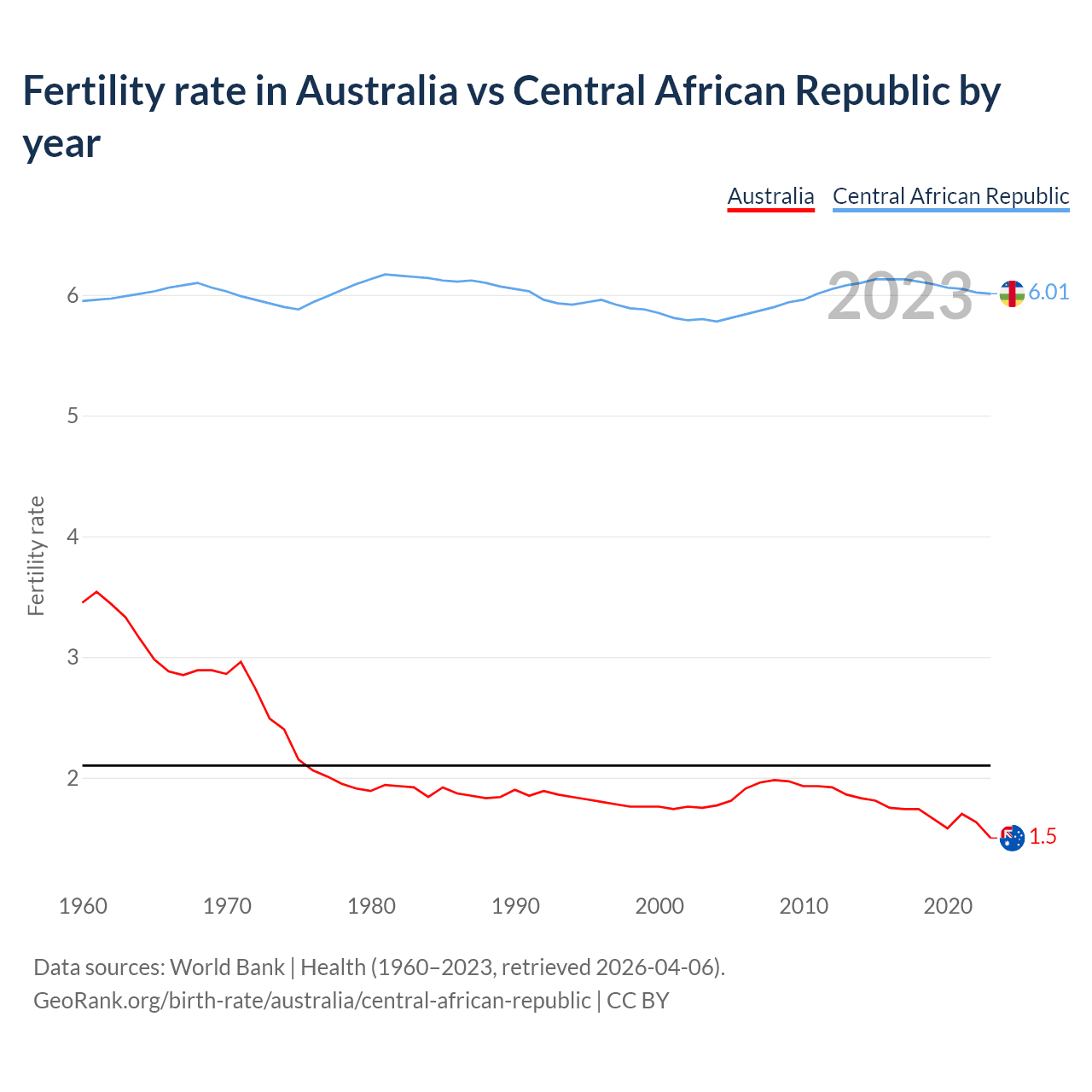 According to the latest available data on birth rates, the fertility rate in Australia was 1.5 children per woman in 2023, compared to 6.01 in the Central African Republic in 2023. The replacement level is considered to be 2.1 children per woman.