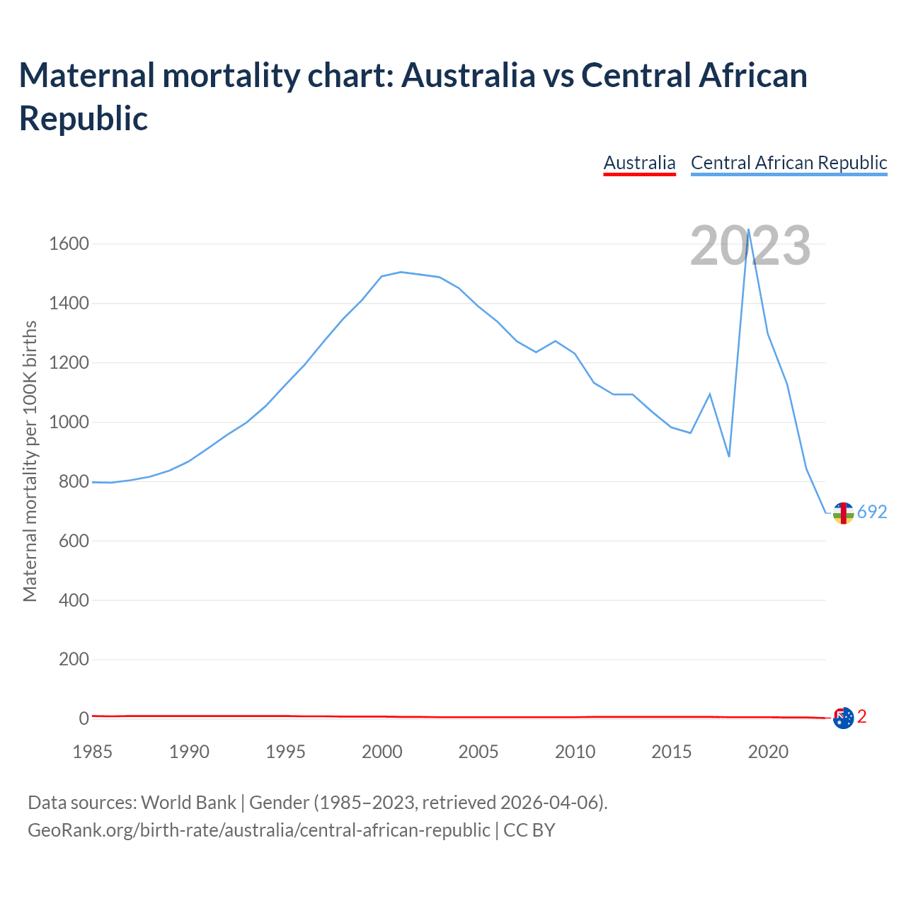 The maternal mortality rate, which is the probability of dying during childbirth or within 42 days of pregnancy termination, is 2 deaths per 100,000 live births in Australia, compared to 692 deaths in the Central African Republic.
