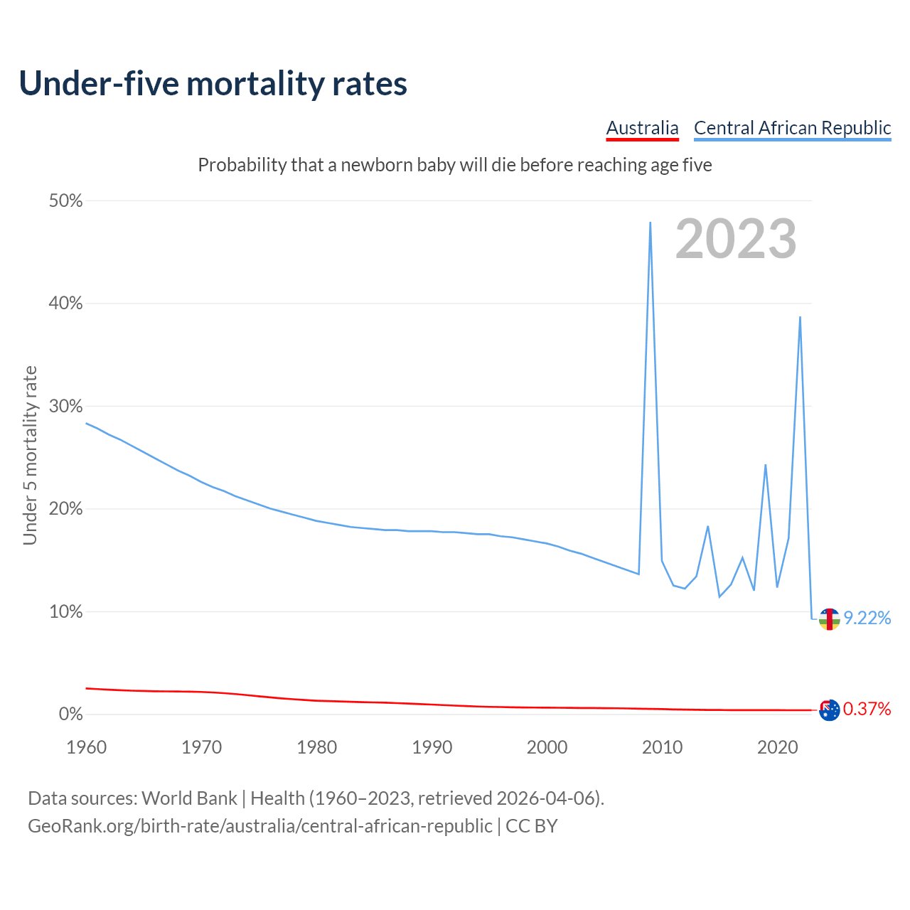 The chance that a newborn baby will die before reaching age five is 0.37% in Australia and 9.22% in the Central African Republic. Above is a chart with historical data on under-five mortality rates.