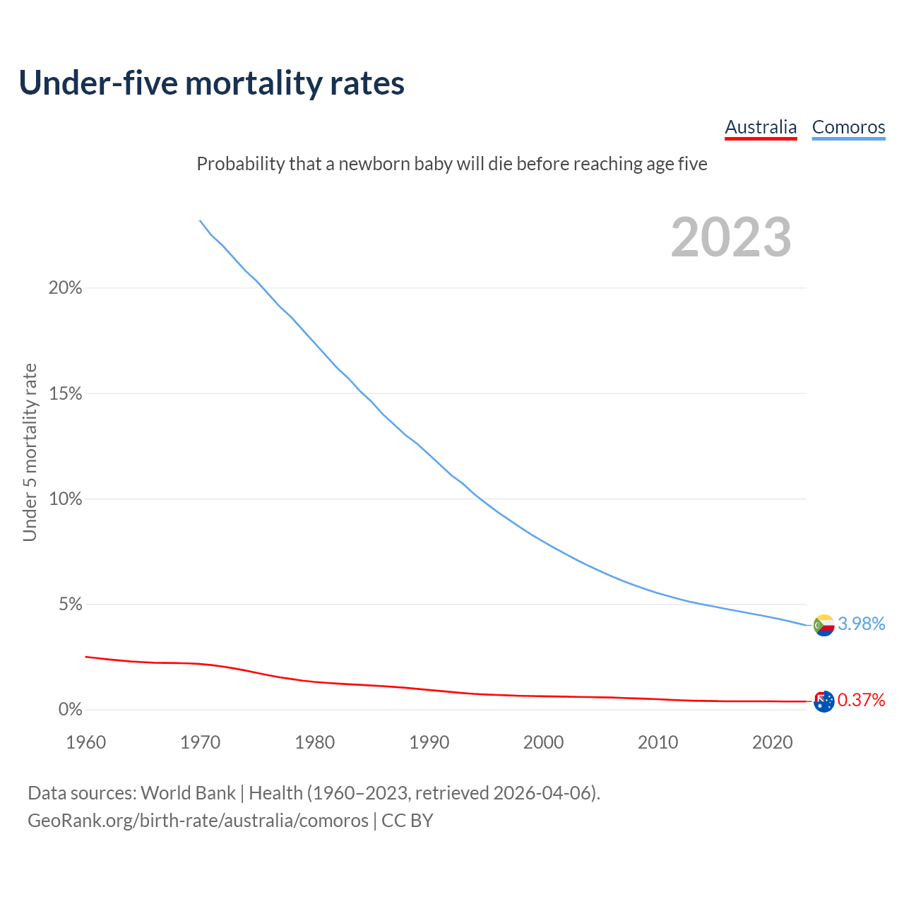 The chance that a newborn baby will die before reaching age five is 0.37% in Australia and 3.98% in Comoros. Above is a chart with historical data on under-five mortality rates.
