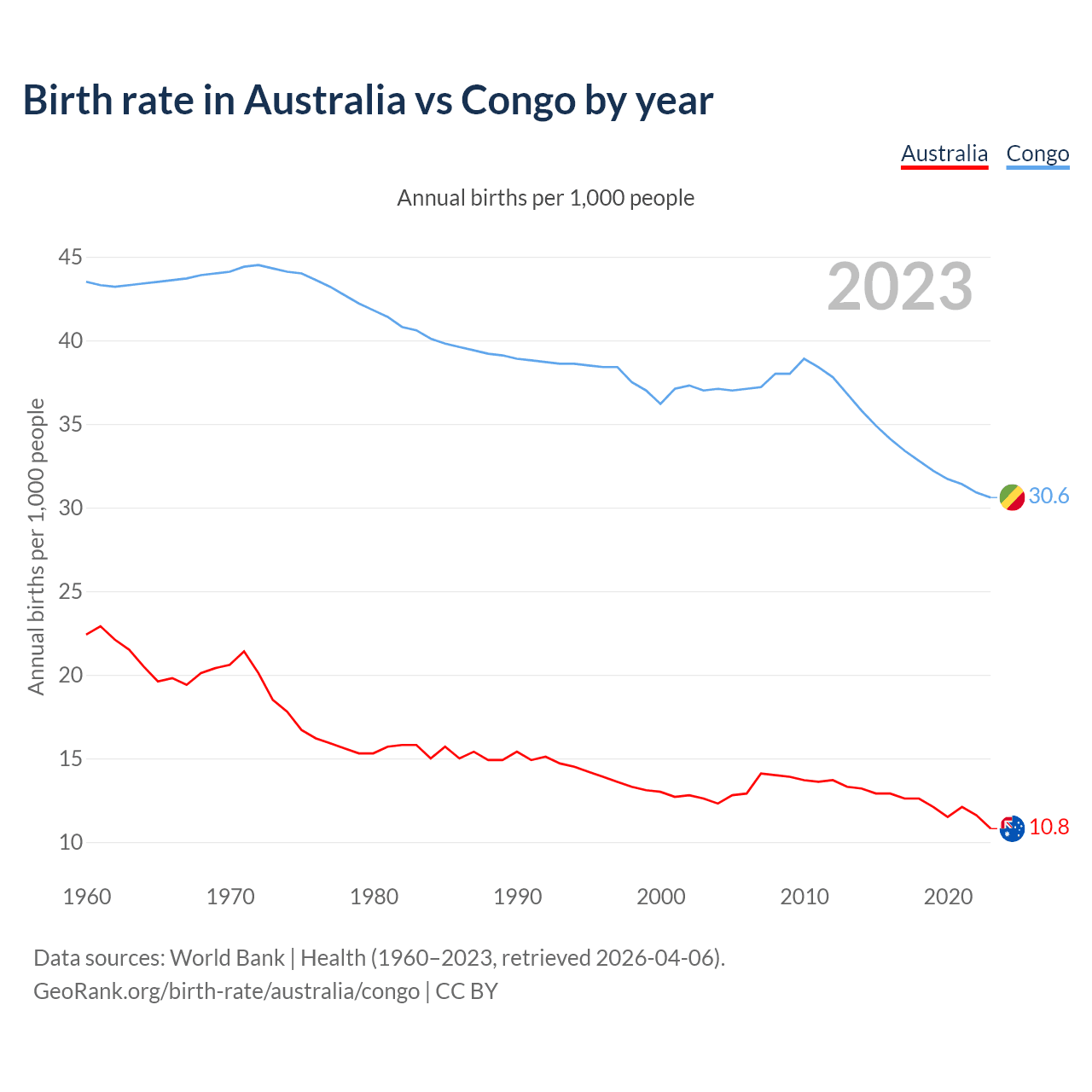 According to the latest available data on birth rates, the fertility rate in Australia was 1.5 children per woman in 2023, compared to 4.16 in the Congo in 2023. The replacement level is considered to be 2.1 children per woman.