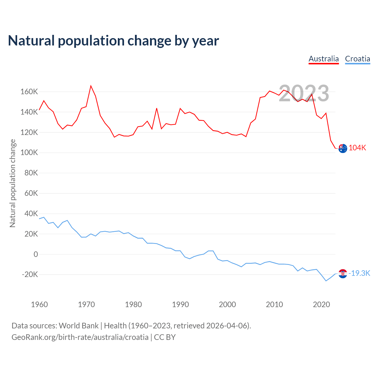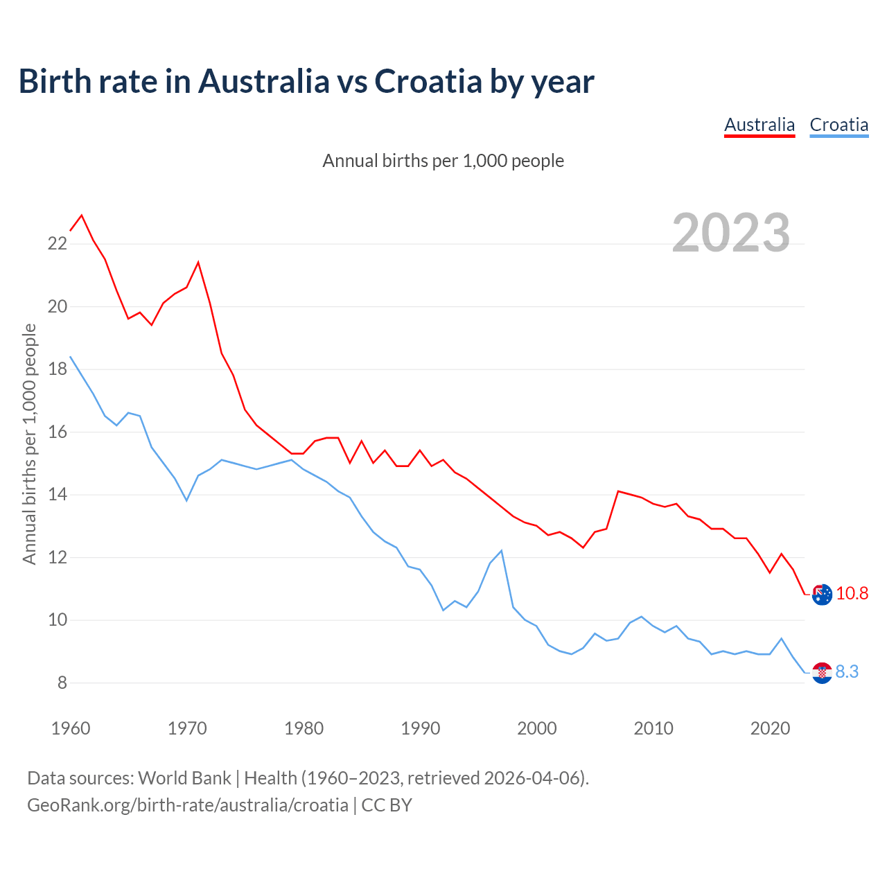 According to the latest available data on birth rates, the fertility rate in Australia was 1.5 children per woman in 2023, compared to 1.46 in Croatia in 2023. The replacement level is considered to be 2.1 children per woman.