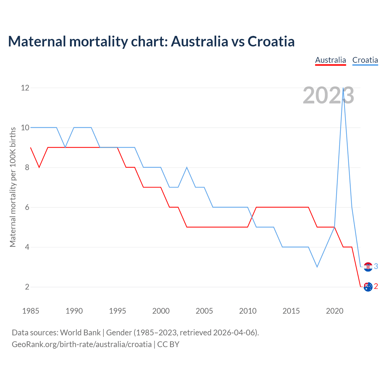 The maternal mortality rate, which is the probability of dying during childbirth or within 42 days of pregnancy termination, is 2 deaths per 100,000 live births in Australia, compared to 3 deaths in Croatia.
