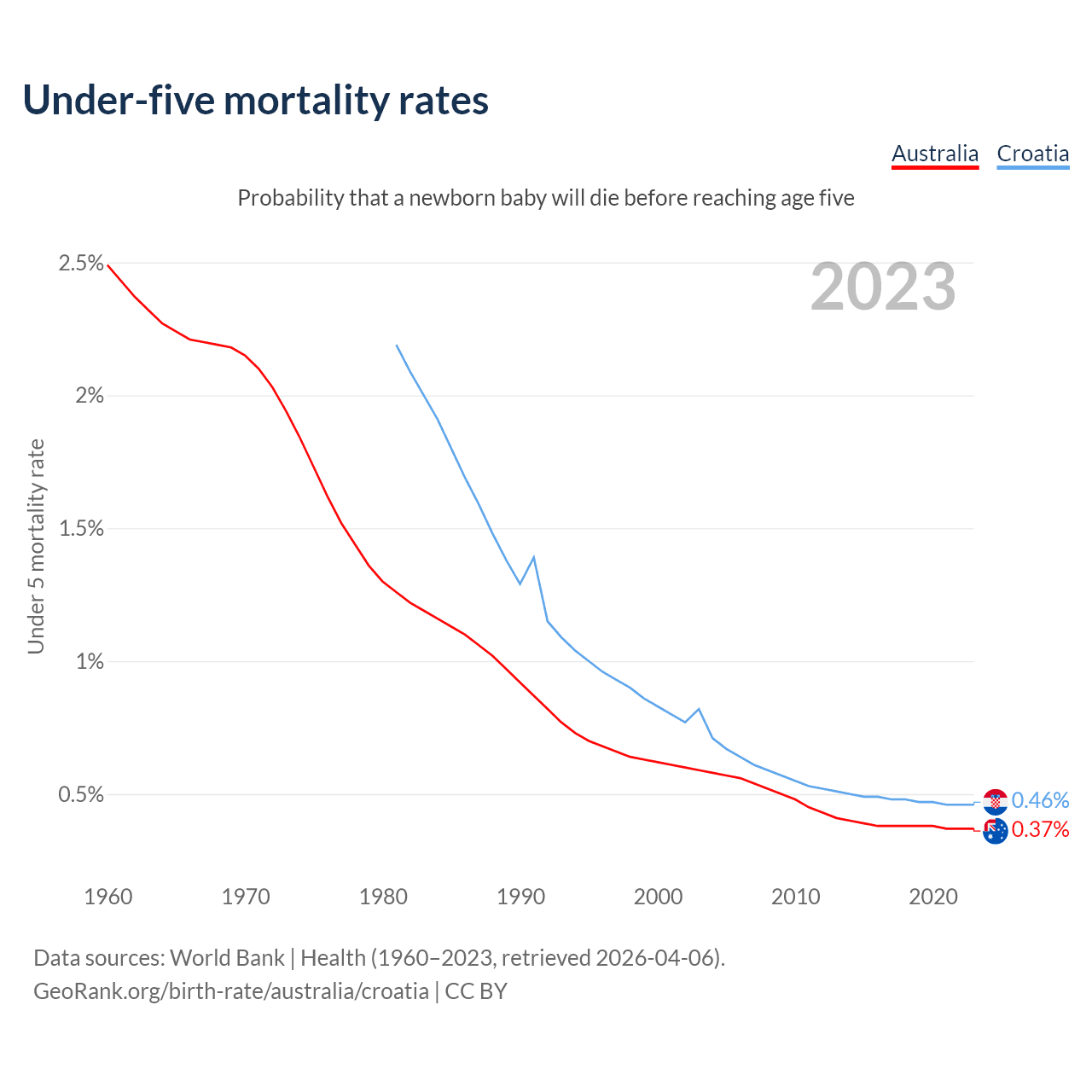 The chance that a newborn baby will die before reaching age five is 0.37% in Australia and 0.46% in Croatia. Above is a chart with historical data on under-five mortality rates.