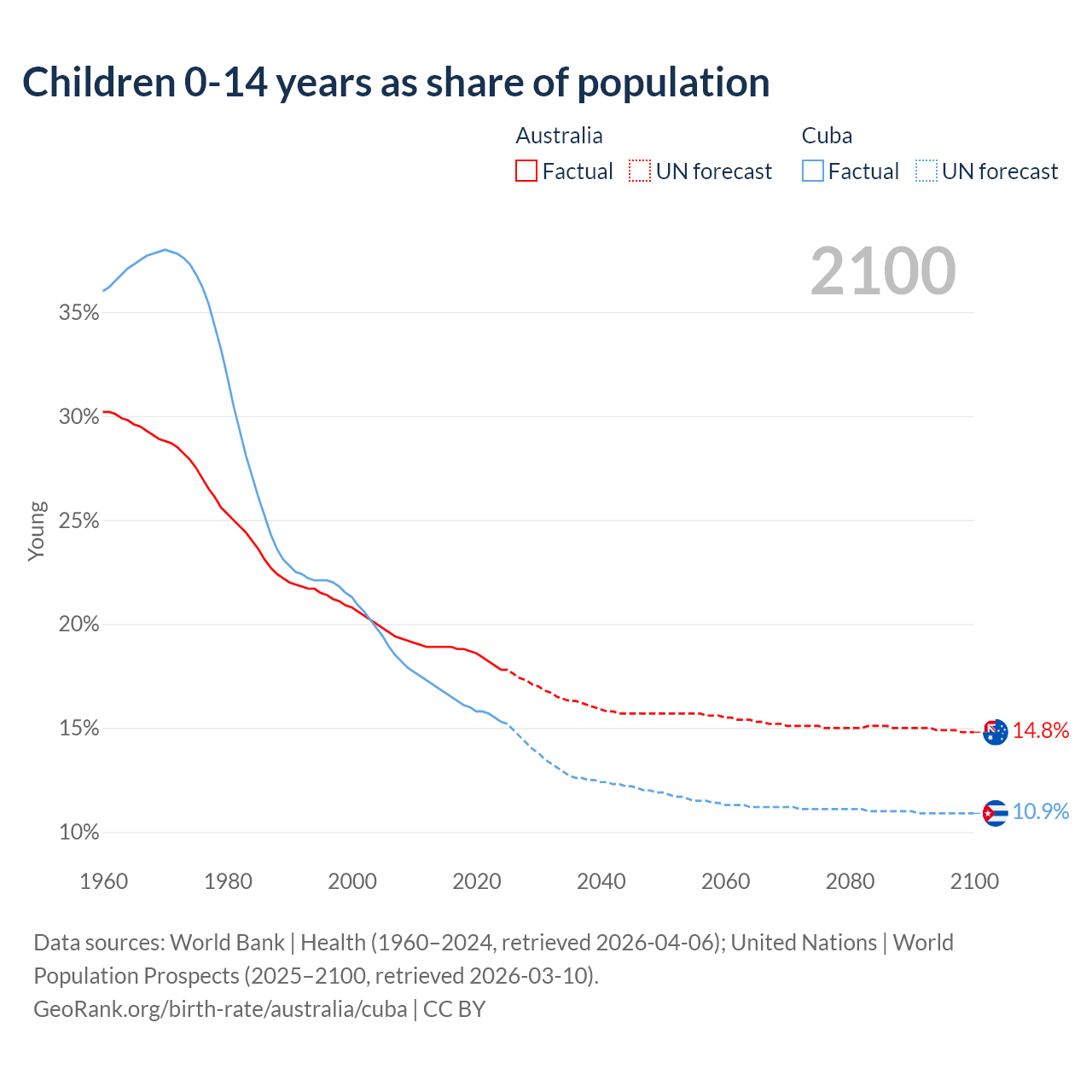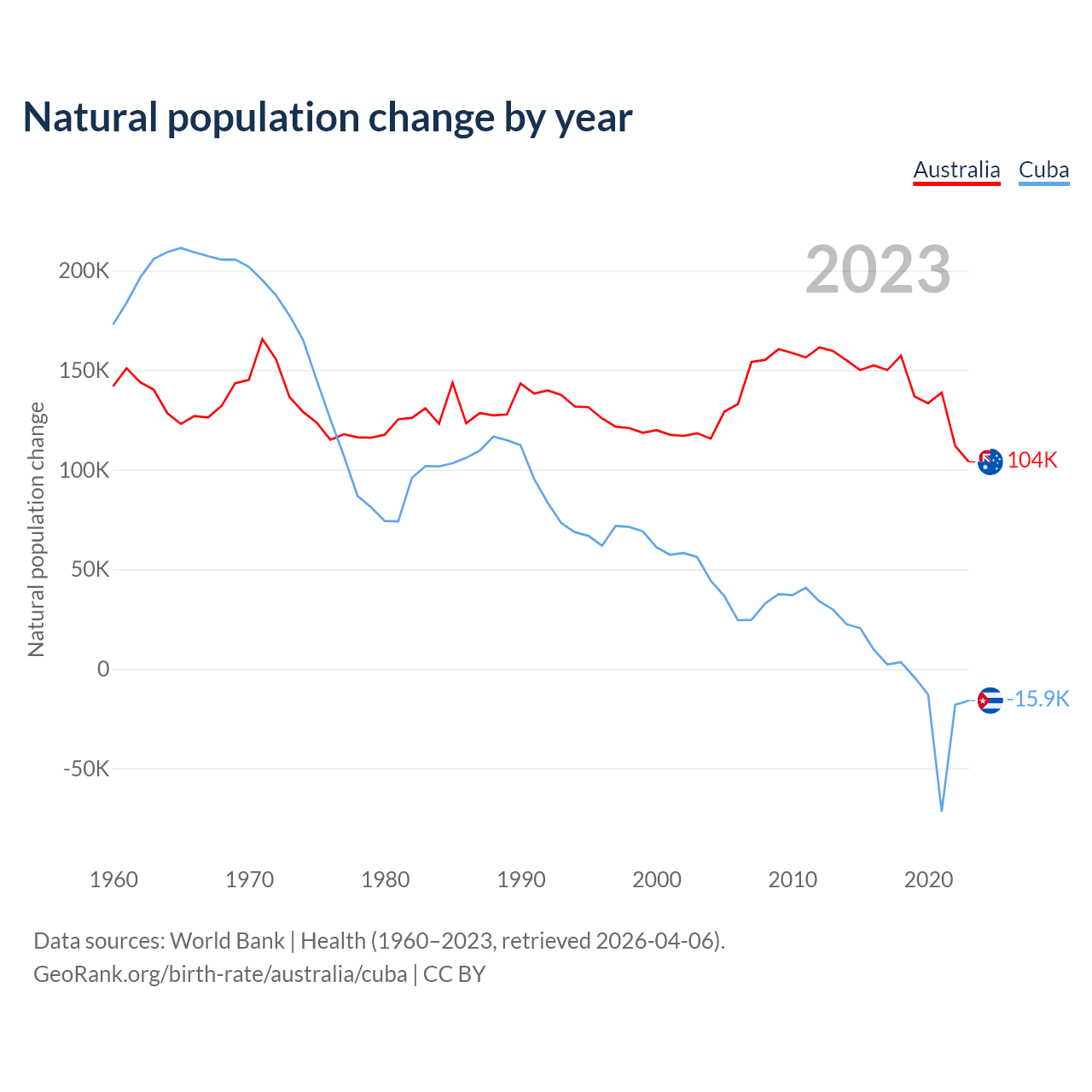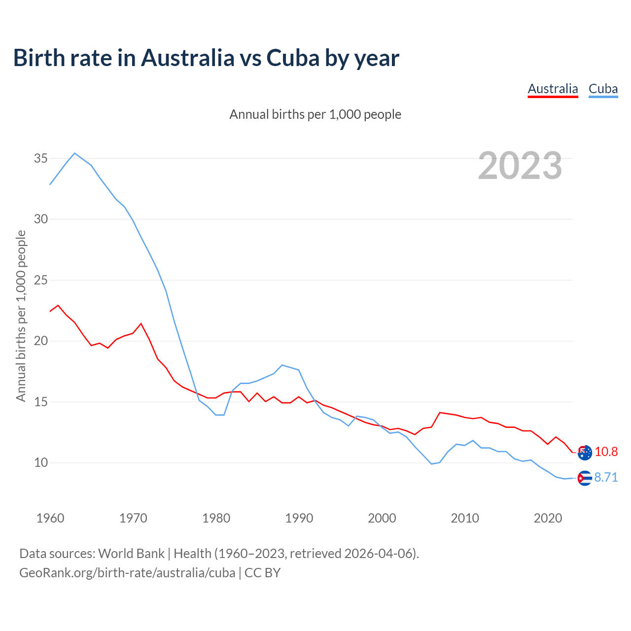 According to the latest available data on birth rates, the fertility rate in Australia was 1.5 children per woman in 2023, compared to 1.44 in Cuba in 2023. The replacement level is considered to be 2.1 children per woman.