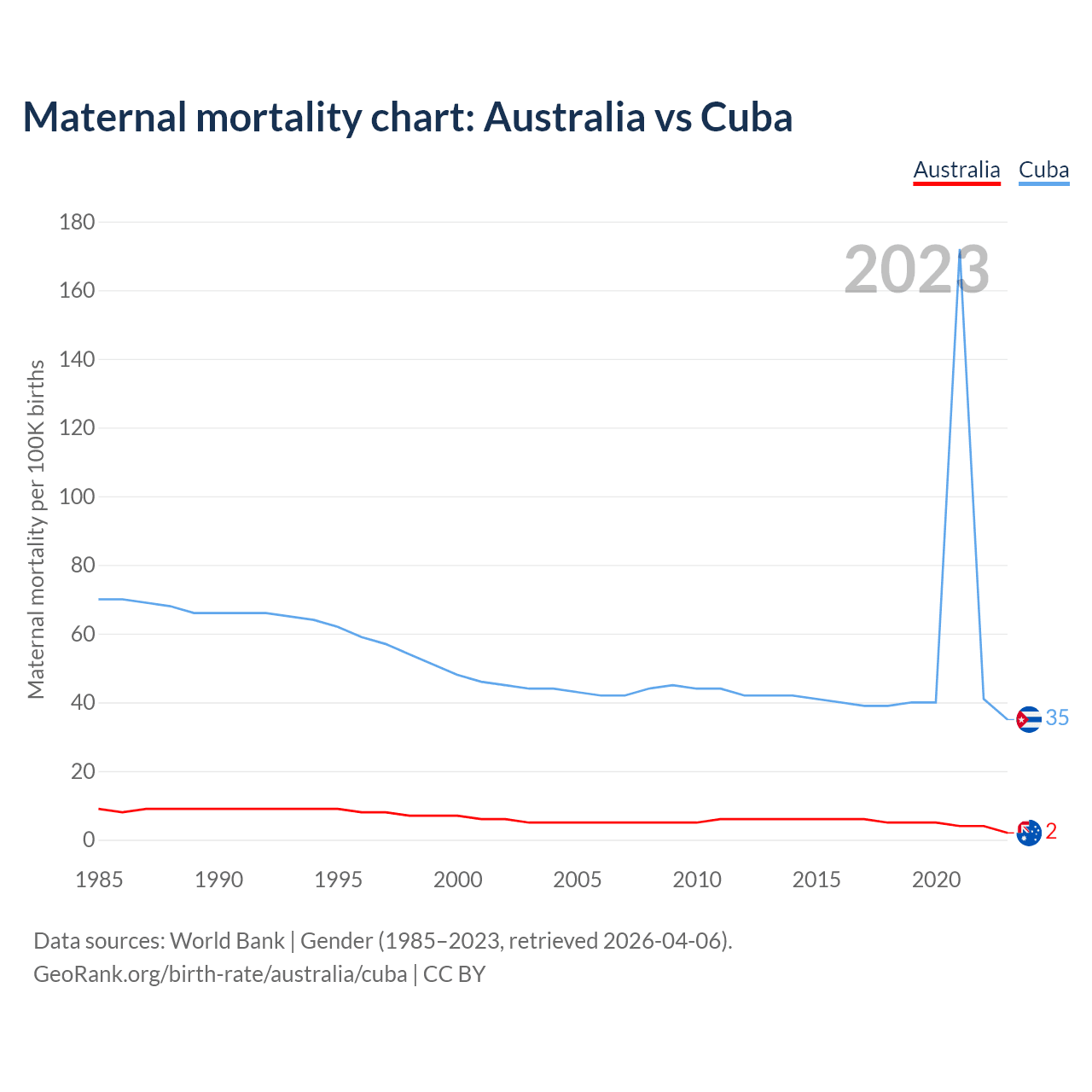 The maternal mortality rate, which is the probability of dying during childbirth or within 42 days of pregnancy termination, is 2 deaths per 100,000 live births in Australia, compared to 35 deaths in Cuba.